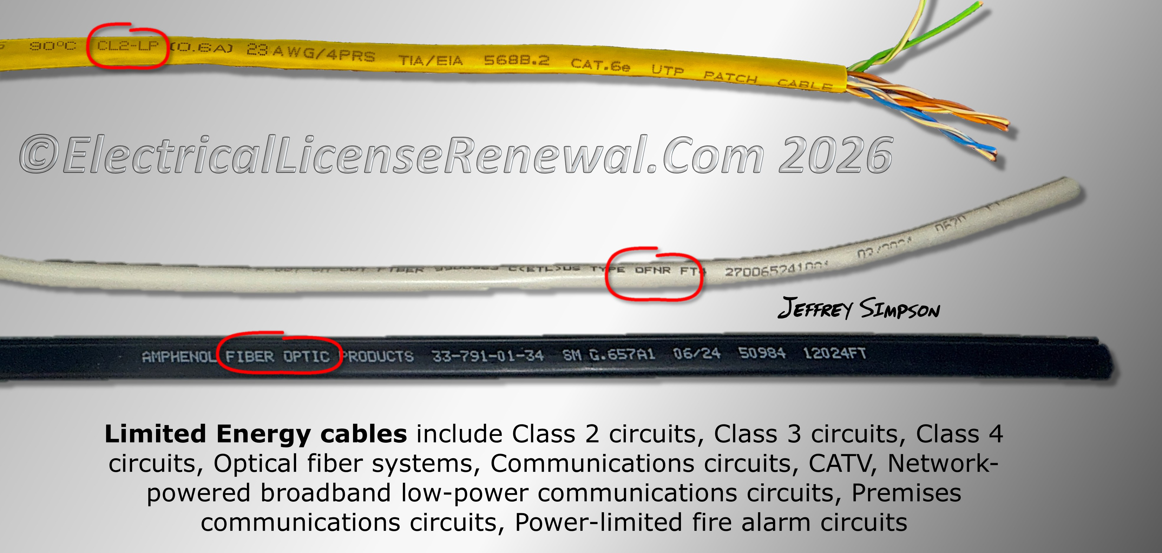 Limited Energy cables include Class 2 circuits, Class 3 circuits, Class 4 circuits, Optical fiber systems, Communications circuits, CATV, Network-powered broadband low-power communications circuits, Premises communications circuits, Power-limited fire alarm circuits.