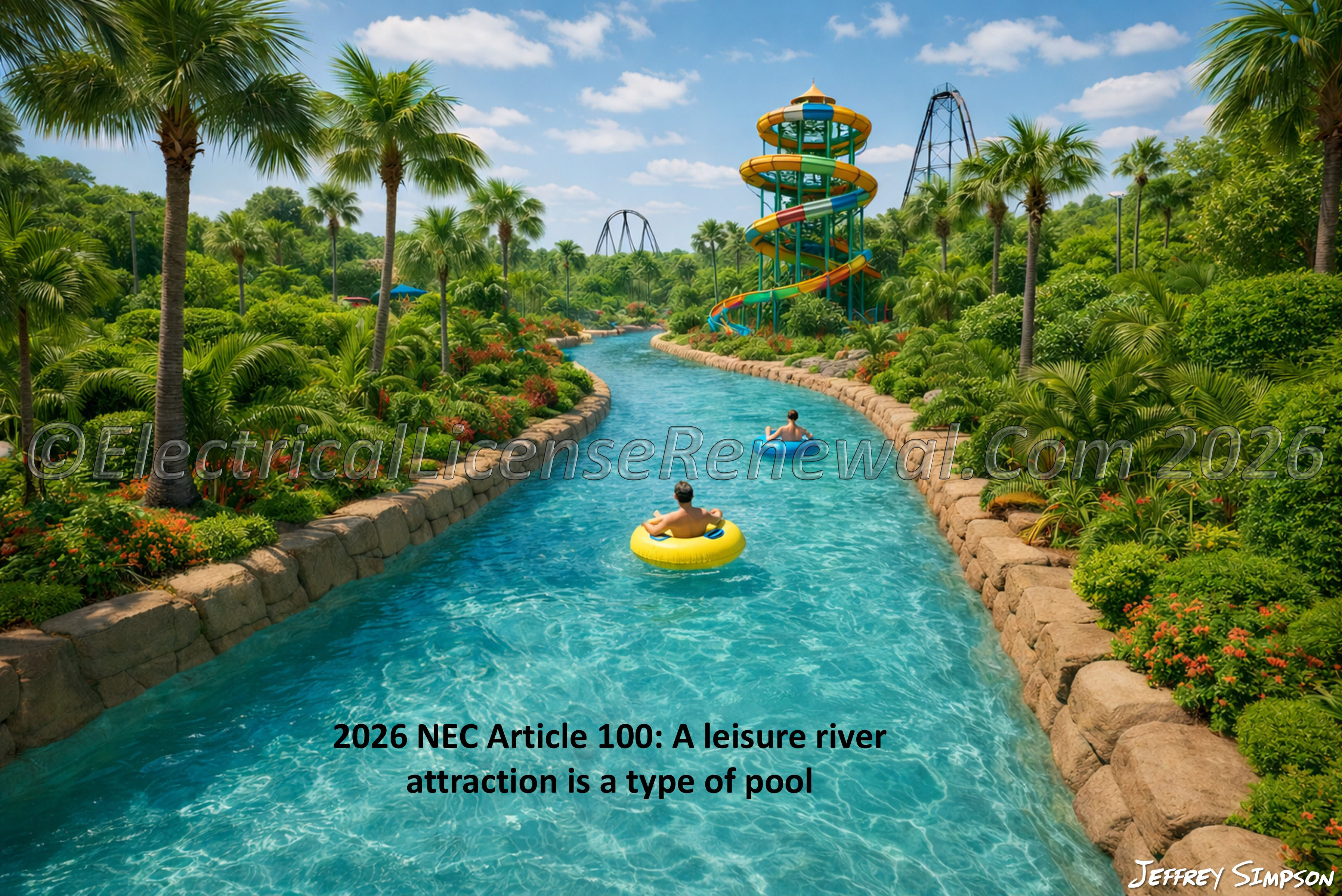 A leisure river attraction typically includes circulating water, a guided current, and user participation. Clarifying that a leisure river is a type of pool points the code user to the requirements in Article 680 for code compliance. These features often include underwater lighting, pumps, motors, and bonding systems, all of which present potential electrical hazards if not properly addressed.