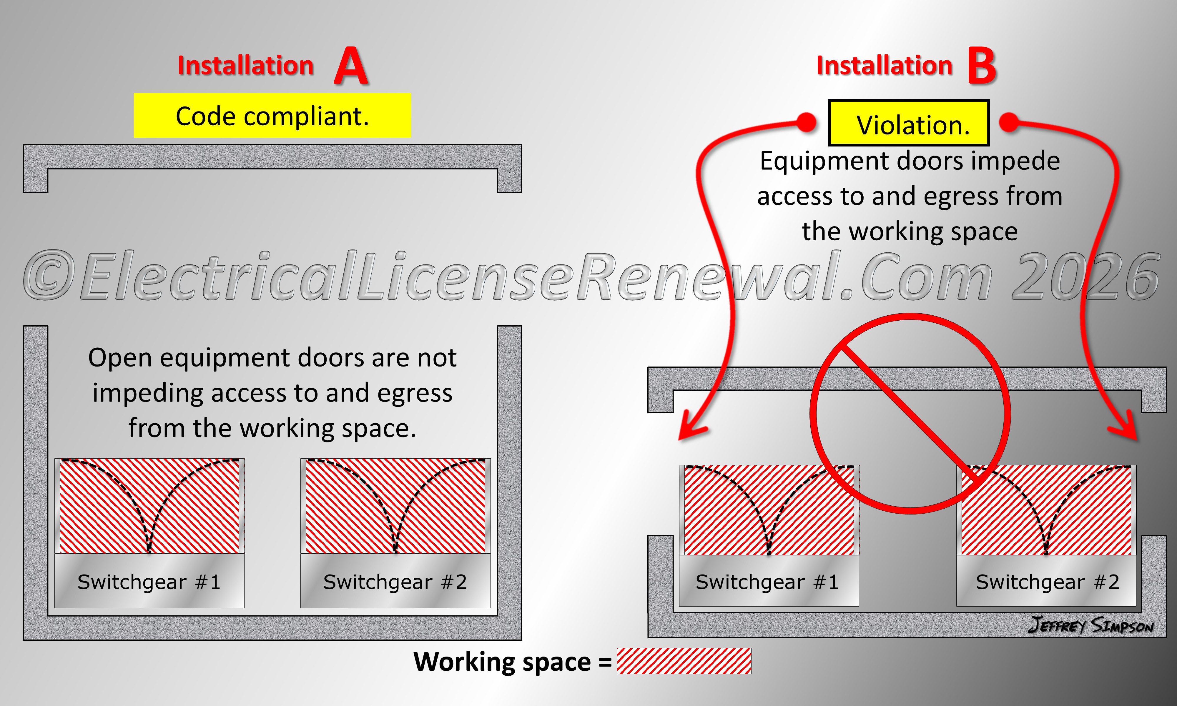 SME commentary: In the 2026 NEC® a public comment from the Electrical Training Alliance was accepted to further explain a scenario where electrical equipment doors can potentially block access to and egress from the working space.