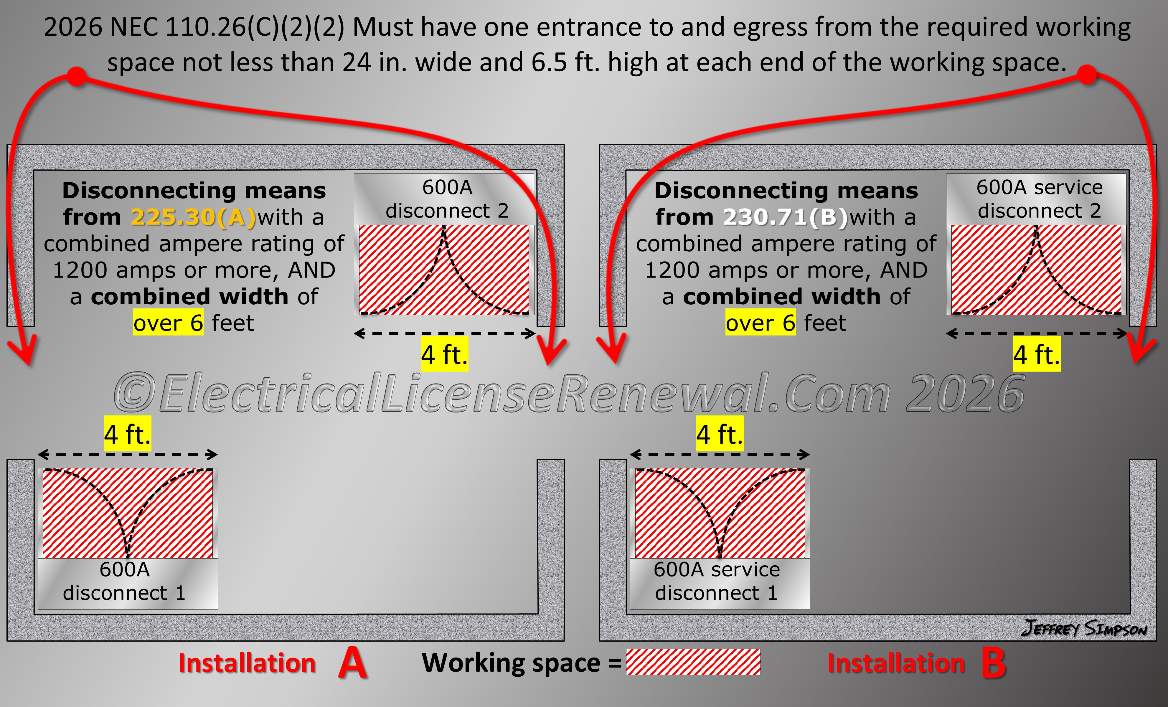 In the 2026 NEC®, this concept for “Large Equipment” has been broadened to apply to ALL disconnecting means (not just service disconnects) installed in accordance with 225.33(A) or 230.71(B) where the combined ampere rating is 1200 amperes or more and where the combined width is over 6 feet.
