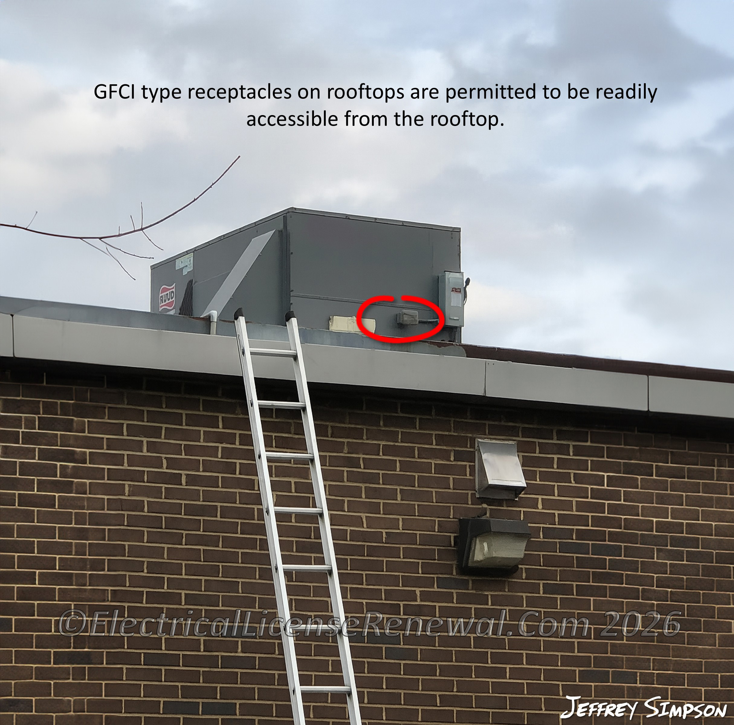 Another notable revision to Section 210.8 in the 2026 NEC® involves the relocation of an exception that was previously found in 210.8(B). This exception originally applied only to GFCI type receptacles located on rooftops in occupancies other than dwellings. By moving this exception to the parent text of 210.8, the Code now makes it clear that the rule (permitting GFCI type receptacles on rooftops to be readily accessible from the rooftop) applies universally, regardless of occupancy type. This exception provides relief for situations where a portable ladder is needed to access a rooftop for equipment servicing (such as HVAC) which technically renders any associated rooftop receptacles as not “readily accessible” according to the Article 100 definition of the term. If the GFCI device on the rooftop receptacle trips, then the technician can simply reset the device from the rooftop instead of being forced to go back down the ladder to reset a grade level GFCI device supplying a rooftop receptacle.