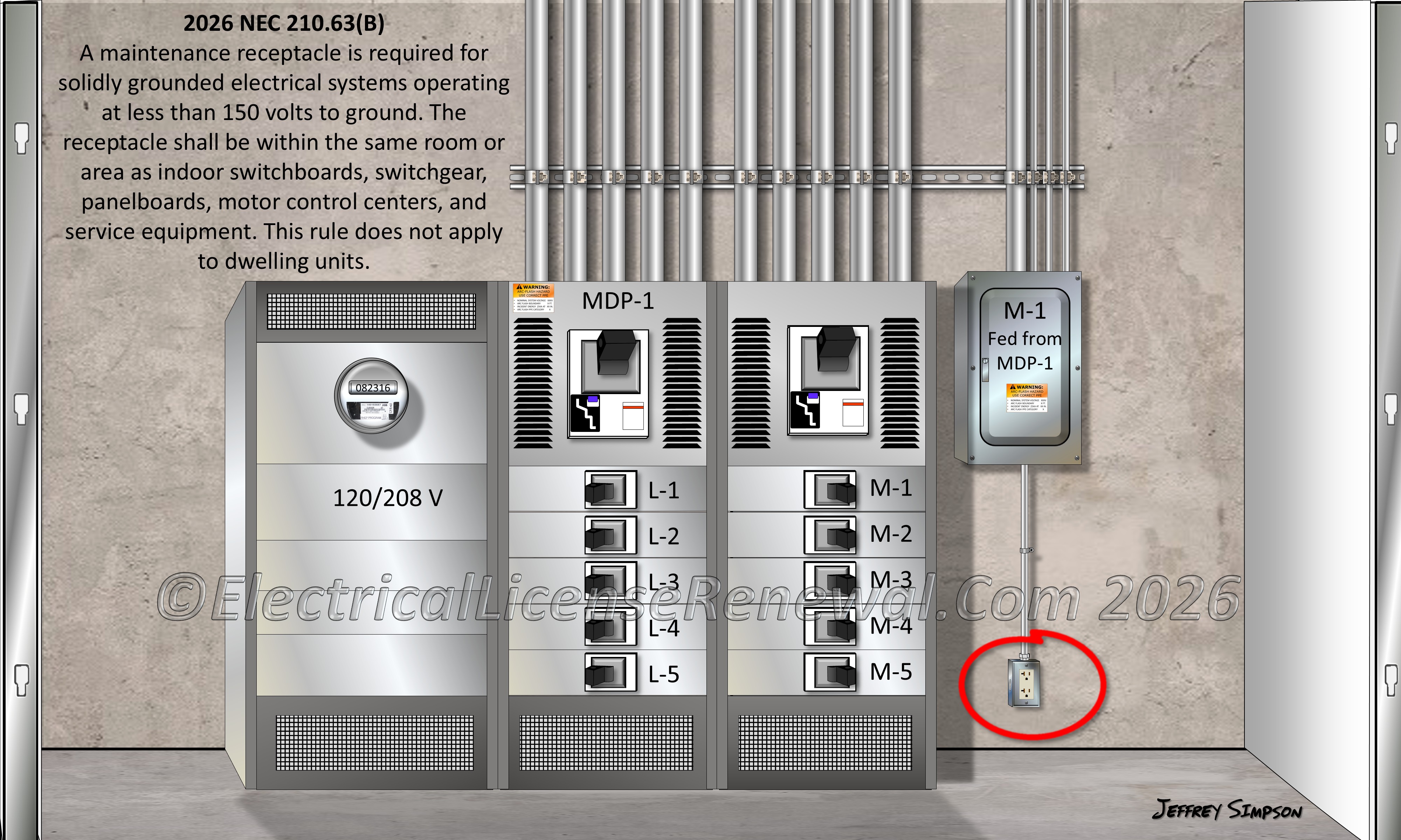 A significant technical refinement is the new voltage thresholds in the revised code language. The receptacle is required only “for wiring systems that include a solidly grounded system operating at less than 150 volts to ground.” Where a facility has a 120/208-volt or 120/240-volt system, the receptacle is required and is ordinarily a 125-volt, 15- or 20-ampere convenience outlet installed in the same room or area as the indoor switchboard, switchgear, panelboard, motor control center, or service equipment. Buildings with only a 277/480-volt solidly grounded system, or an ungrounded 480-volt system would not trigger the receptacle requirements in 210.63(B) otherwise designers would need to add a step-down transformer solely to supply a maintenance receptacle. This change eliminates indoor electrical rooms that contain only 480-volt motor control centers or similar equipment that typically do not use a neutral conductor and have no need for a step-down transformer.