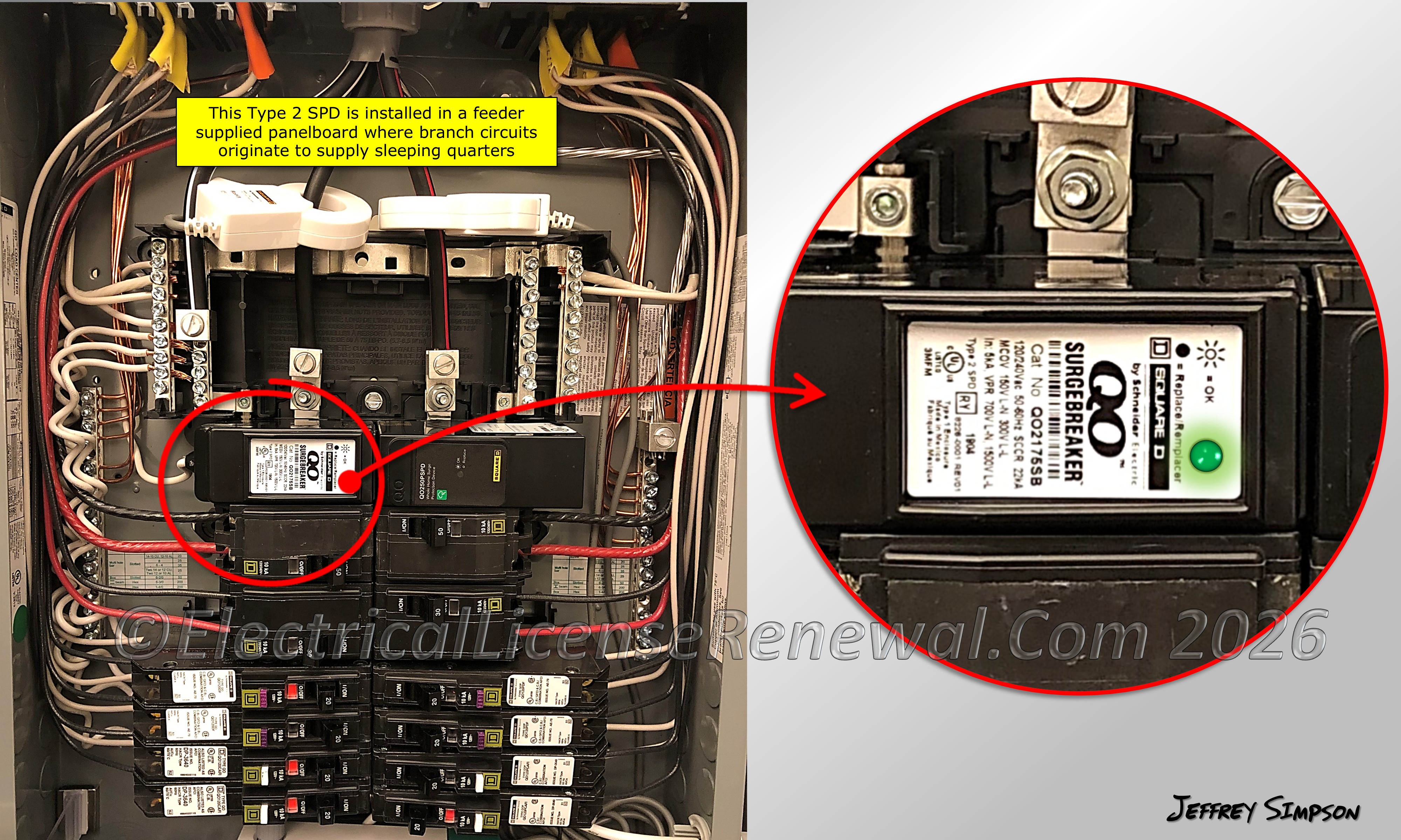 This Type 2 SPD is installed in a feeder supplied panelboard where branch circuits originate to supply sleeping quarters.