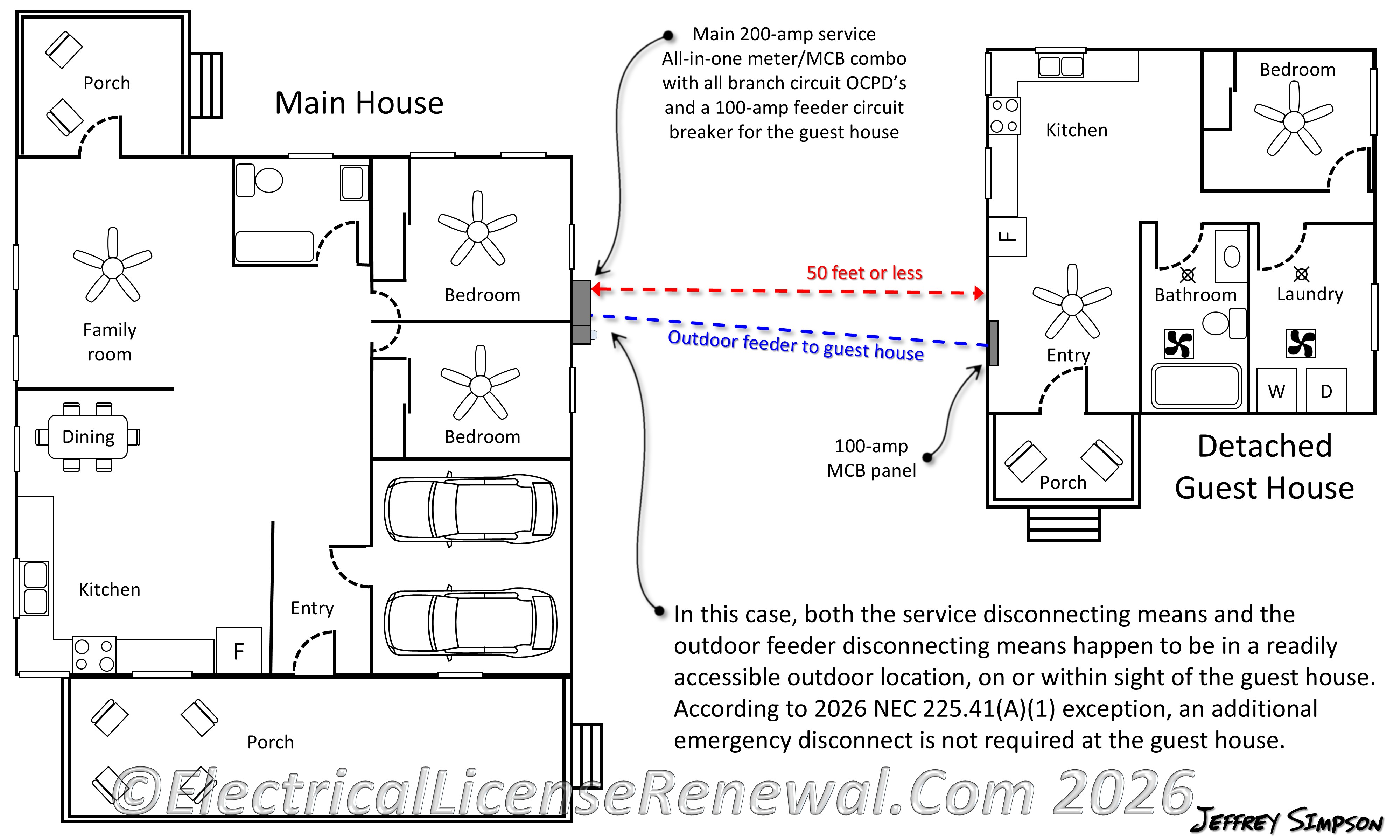 While the 2023 rule established an important safety benchmark, it also created confusion in situations where a dwelling unit was supplied by a feeder rather than a direct service. Detached guest houses on the same property that qualify as a one- or two-family dwelling may be served by feeders that originate from the main house or another structure. Similarly, in some configurations, even the main dwelling can be feeder-supplied from a common service location nearby that also provides power to another dwelling unit on the same property. Under the 2023 language, these buildings could be interpreted as needing their own separate emergency disconnect, even though the upstream feeder disconnect was already located in a code-compliant outdoor and readily accessible location and within sight of the dwelling it supplies.