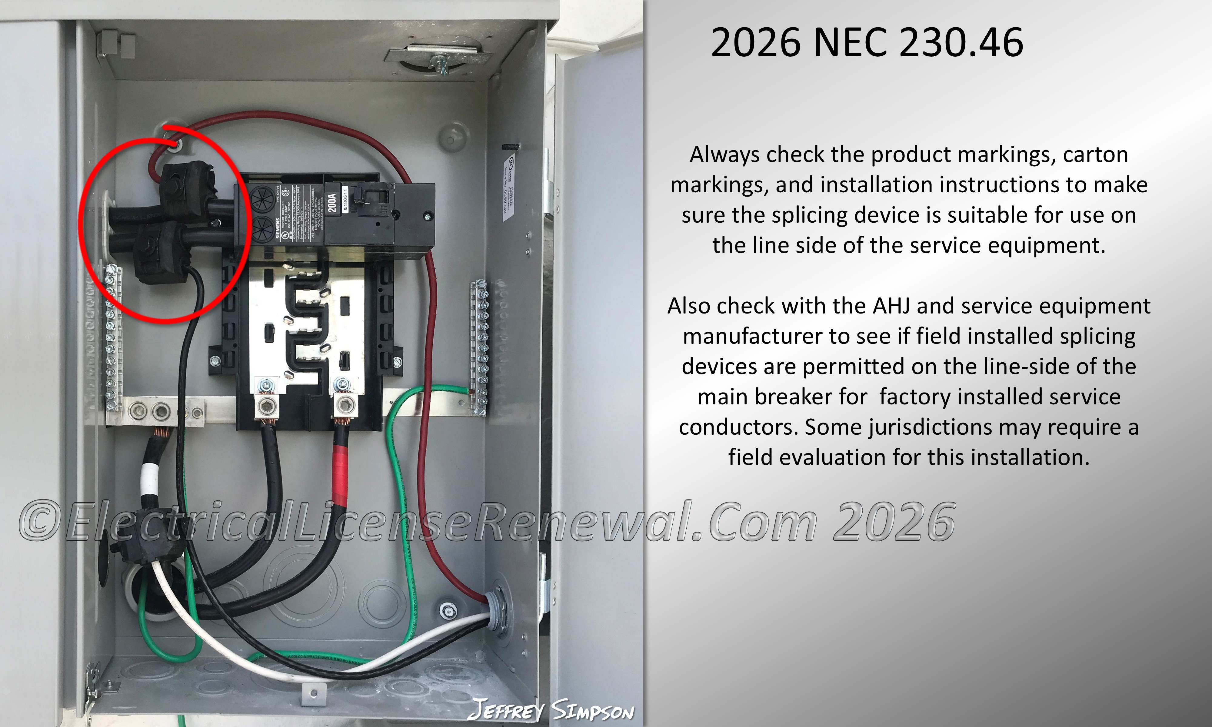 2026 NEC® Section 230.46 now specifies that equipment installed on service conductors shall be marked or identified as “suitable for use on the line side of the service equipment” or an equivalent designation. The list that follows names the affected components and includes:
