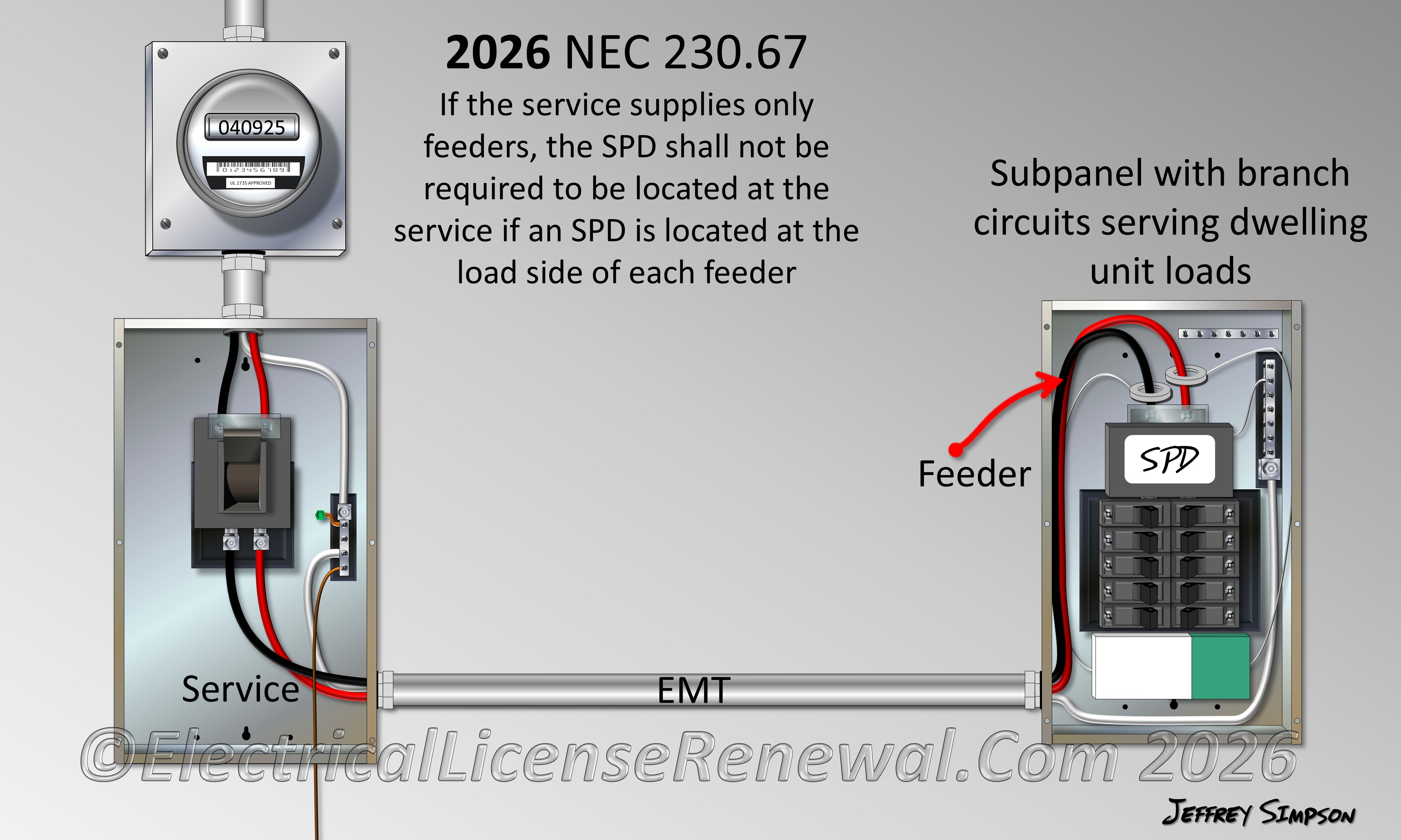 Lastly, revisions to the exception in 230.67(B) help bring clarity for service configurations where the service ONLY supplies feeders. For these installations, the SPD is not required at the service and is permitted to be placed downstream at the load end of the feeder. The previous language left a gray area for installations such as an outdoor service with limited branch circuit breaker spaces. These typically include feed-through lugs to supply a downstream subpanel. Some felt that an SPD could be omitted from the outdoor service in this configuration as long as an SPD was installed at the next level subpanel where the majority of the branch circuit breakers resided. Based on the 2026 NEC® revisions to 230.67, for this example, surge protection is required at the service by 230.67(B) and an additional SPD is required by 215.18 in or adjacent to the subpanel connected to the load side of the feeder if the distribution equipment contains OCPDs that supply the areas specified in 230.67(A).