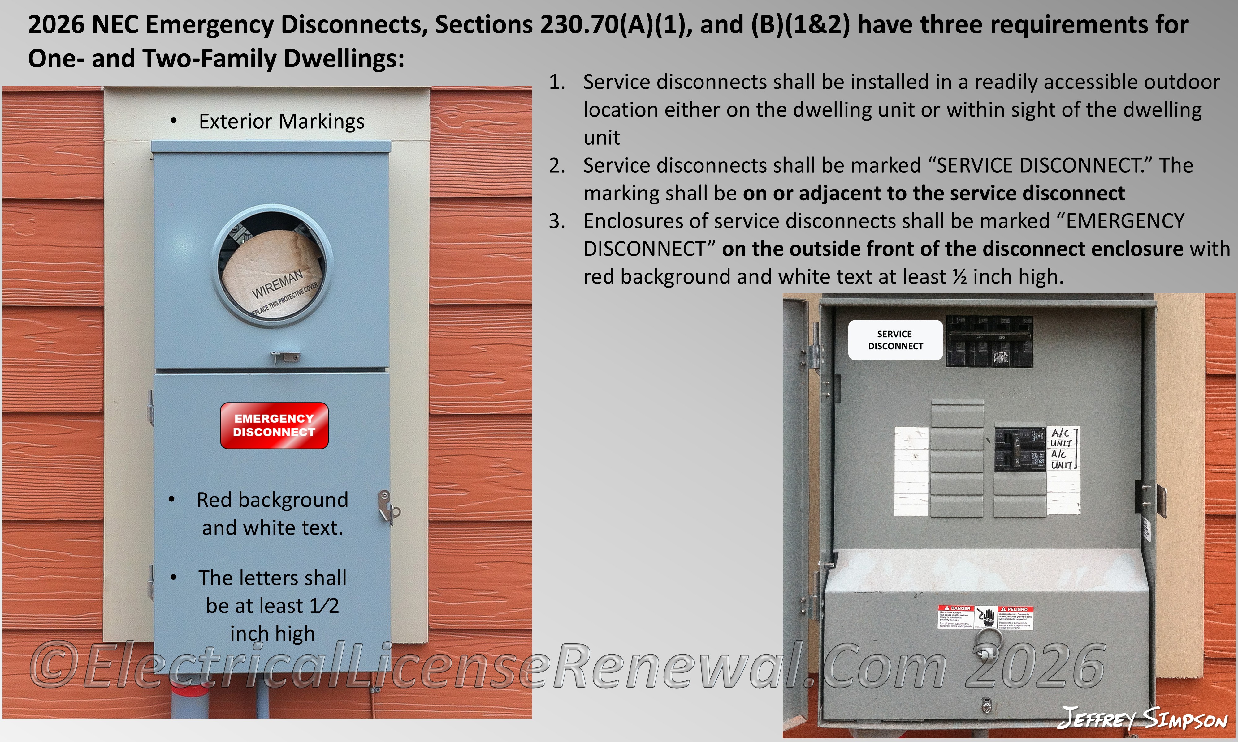 Changes to 230.70(B) also clarify how service disconnects are to be marked. Each disconnect must now be marked as “SERVICE DISCONNECT”. This marking shall be on or adjacent to the service disconnect. Additionally, for one- and two-family dwellings, the enclosures of disconnects must also be labeled “EMERGENCY DISCONNECT.” This marking must be placed on the outside front of the disconnect enclosure with red background, white text, using letters at least 1/2 inch high. These marking requirements ensure immediate recognition during an emergency and align with the NEC’s ongoing emphasis on usability and field safety.