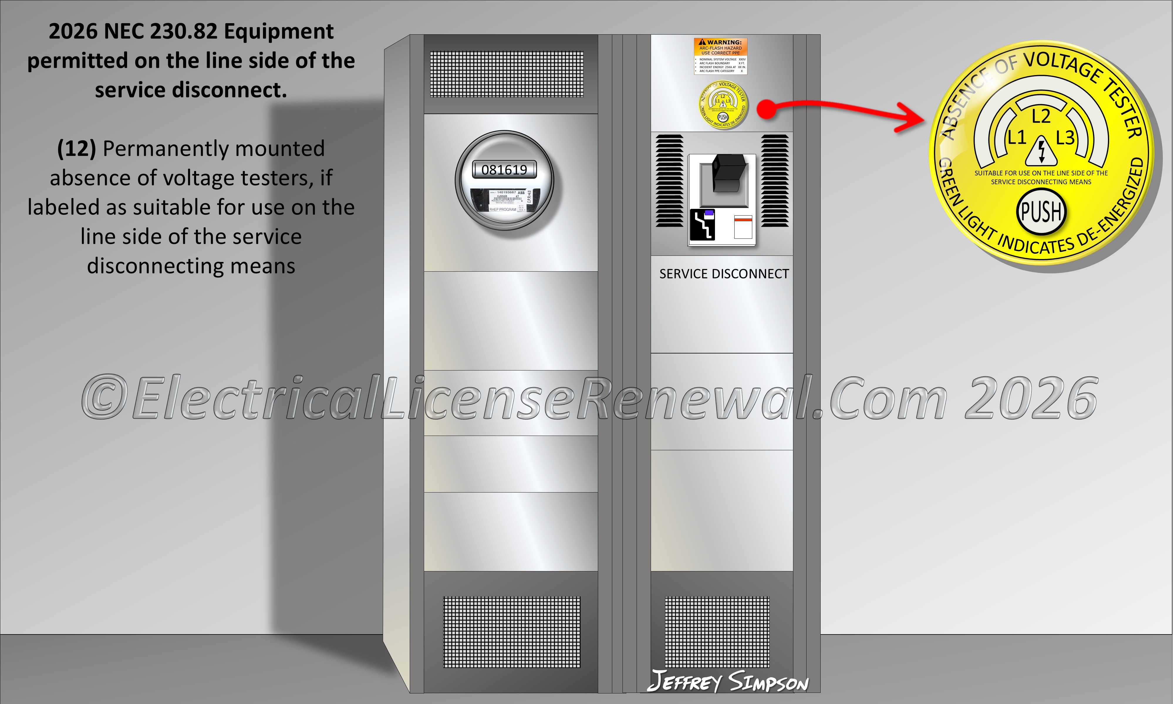 Two new categories of equipment were also added to Section 230.82(8) in the 2026 NEC®. Power distribution blocks, pressure connectors, and splice/tap devices in accordance with 230.46 are now specifically mentioned as permitted supply-side connections. In addition, permanently mounted absence of voltage testers if labeled suitable for use on the line side of the service disconnect have been added in (12), with an Informational Note referencing UL 1436 and NFPA 70E. Both additions reflect the panel’s effort to bring the Code in line with common field practices and evolving technology used in safety verification and power distribution.