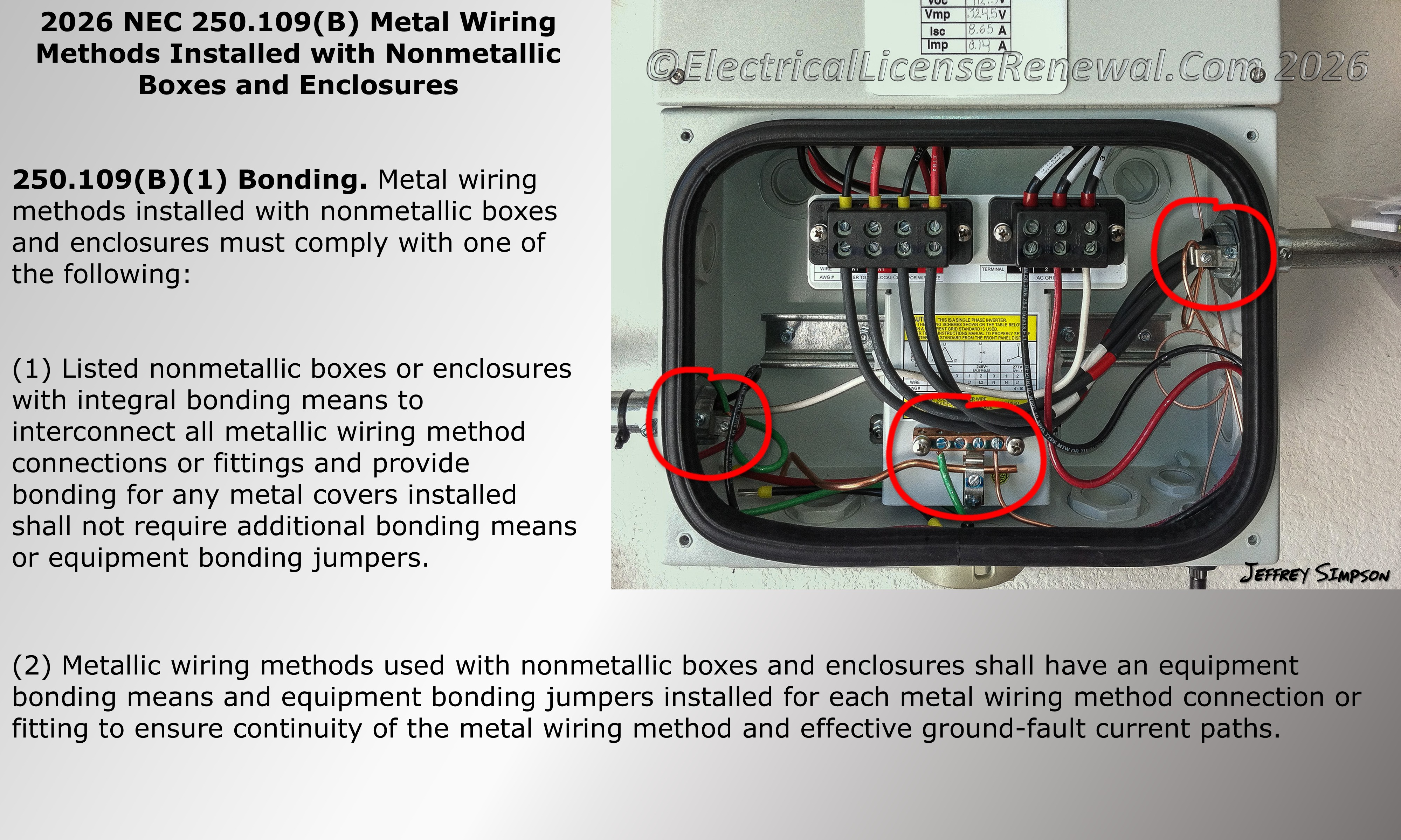 The 2026 revision reorganizes Section 250.109 into two subsections: (A) Metal Enclosures and (B) Metal Wiring Methods Installed with Nonmetallic Boxes and Enclosures. Subsection (A) restates the existing requirements for metallic enclosures, but in list format for clarity. The significant change is found in subsection (B), which establishes bonding requirements when nonmetallic boxes and enclosures are installed with metallic raceways or cables.