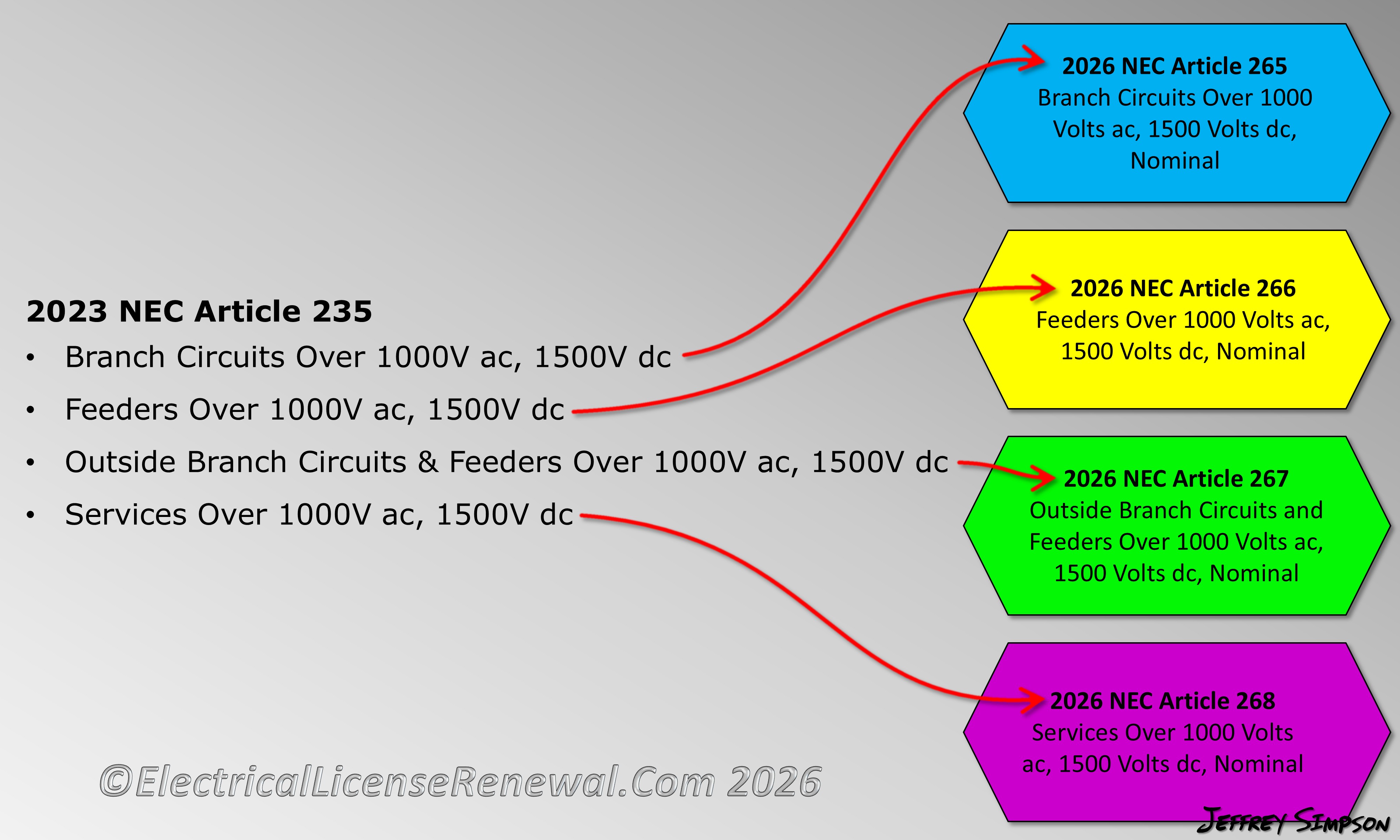The shift mirrors other structural revisions made in Chapter 2 for the 2026 code cycle, including the introduction of Article 265 for branch circuits, Article 267 for outside branch circuits and feeders, Article 268 for services, and Article 270 for grounding and bonding, each applying only to installations over 1000 volts ac or 1500 volts dc, nominal.