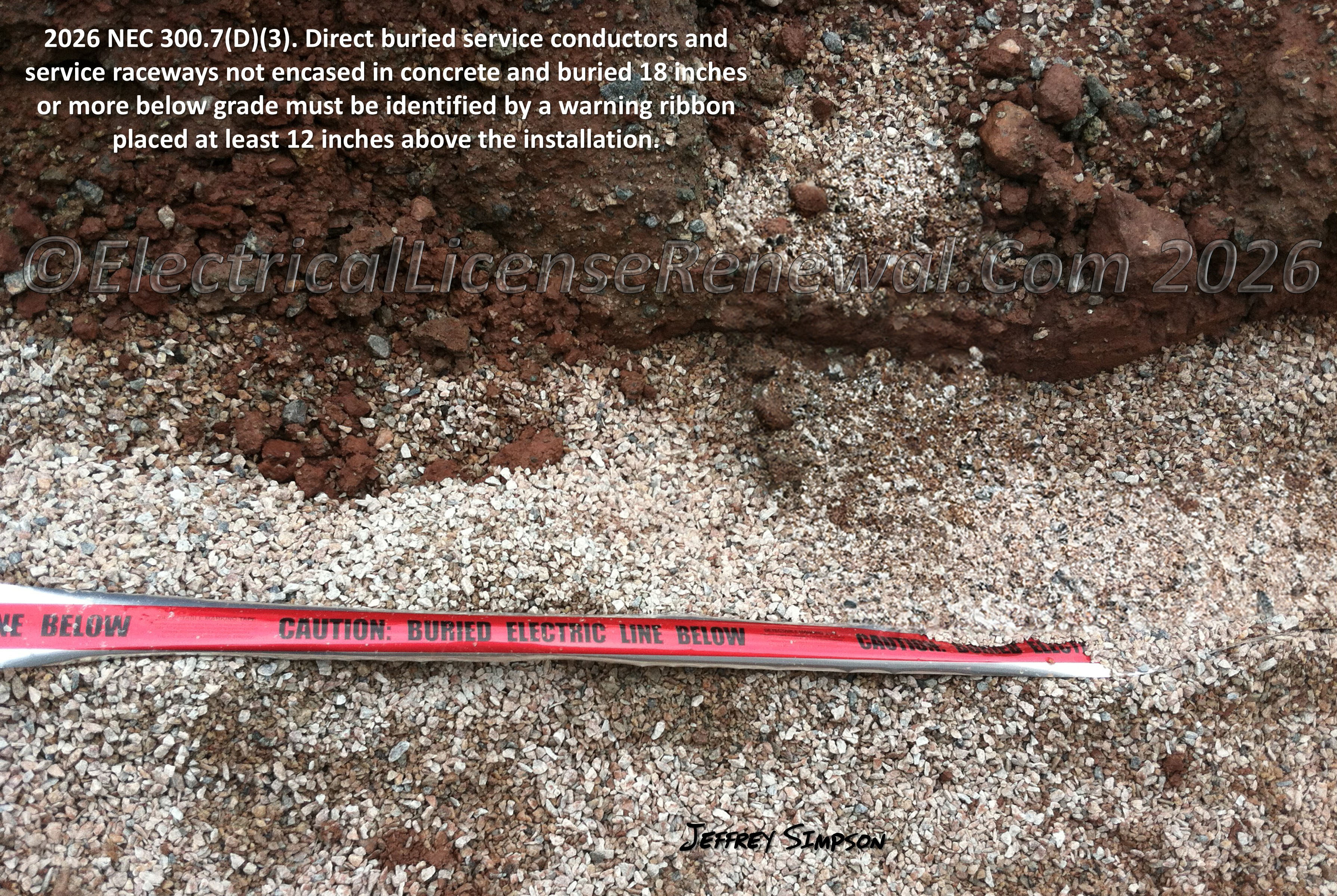 300.7(D)(3) Service Conductors and Raceways. Direct buried service conductors and raceways containing service conductors that are not encased in concrete and that are buried 18 inches or more below grade shall have their location identified by a warning ribbon that is placed in the trench at least 12 inches above the underground installation.