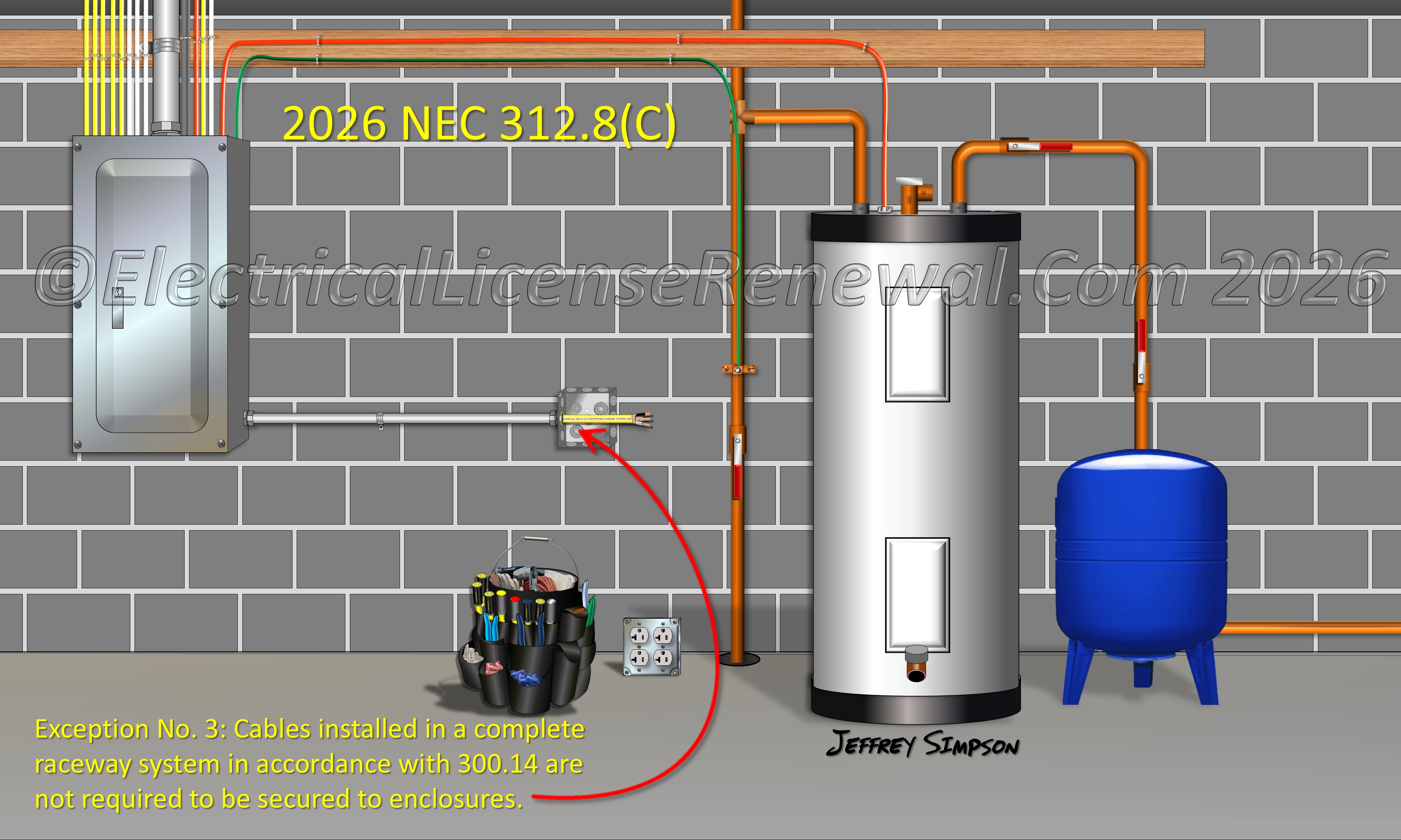 SME commentary: In the 2026 NEC®, Section 312.5(C) has been relocated and renumbered as 312.8(C), and a new Exception No. 3 has been added. This new provision addresses situations where multiple cables are routed through a complete raceway system and emerge into an enclosure, making it impractical to secure each individual cable directly to the cabinet, cutout box, or meter socket enclosure as otherwise required by the parent rule.