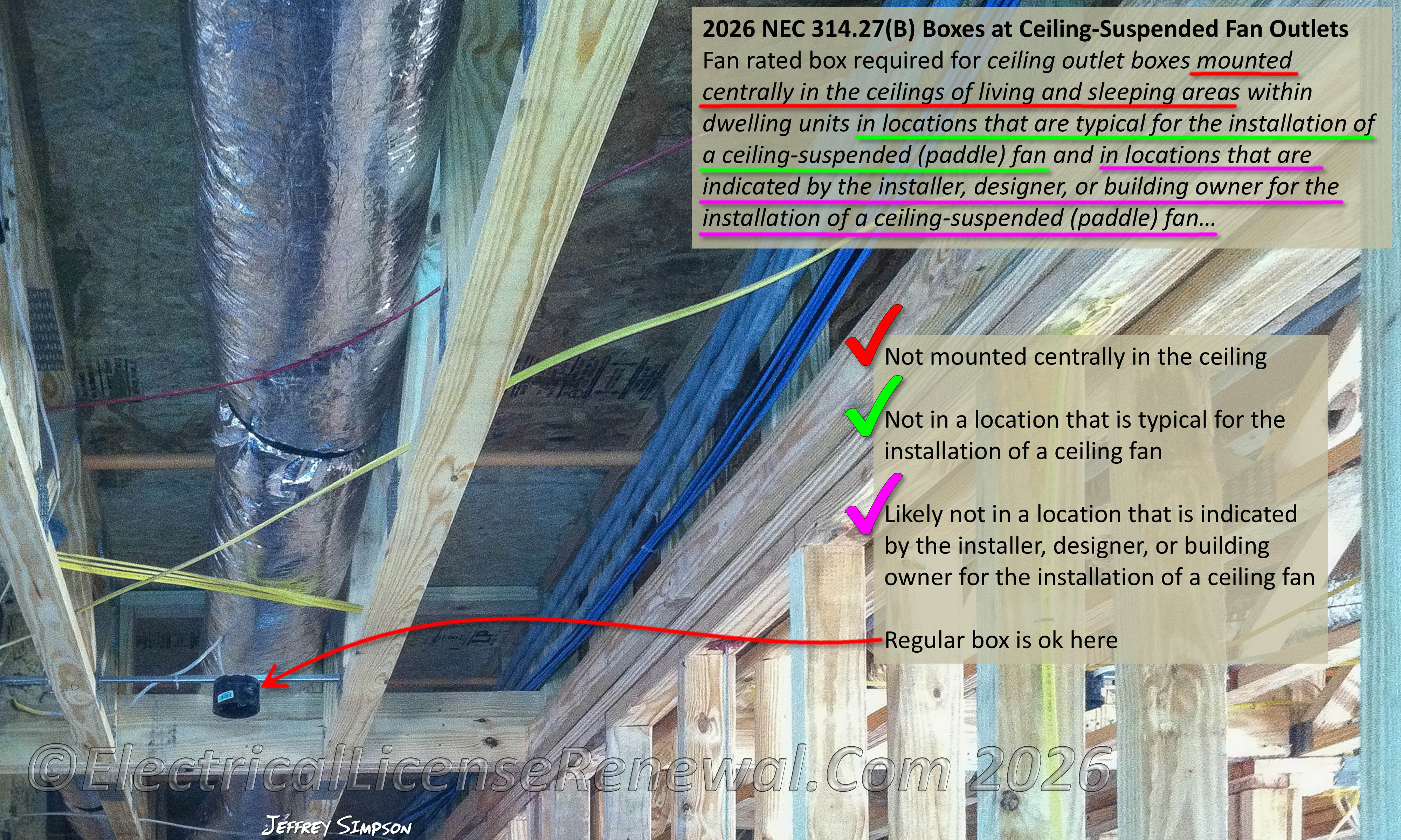 SME commentary: In the 2026 NEC®, what was formerly Section 314.27(C) is now renumbered as 314.27(B) and rewritten to clearly identify where fan-rated outlet boxes must be used. The revision was made in direct response to widespread confusion caused by the 2023 NEC® phrase “in a location acceptable for the installation of a ceiling-suspended paddle fan.” That phrase left inspectors and installers uncertain about which ceiling outlet boxes actually required a fan-rated box.