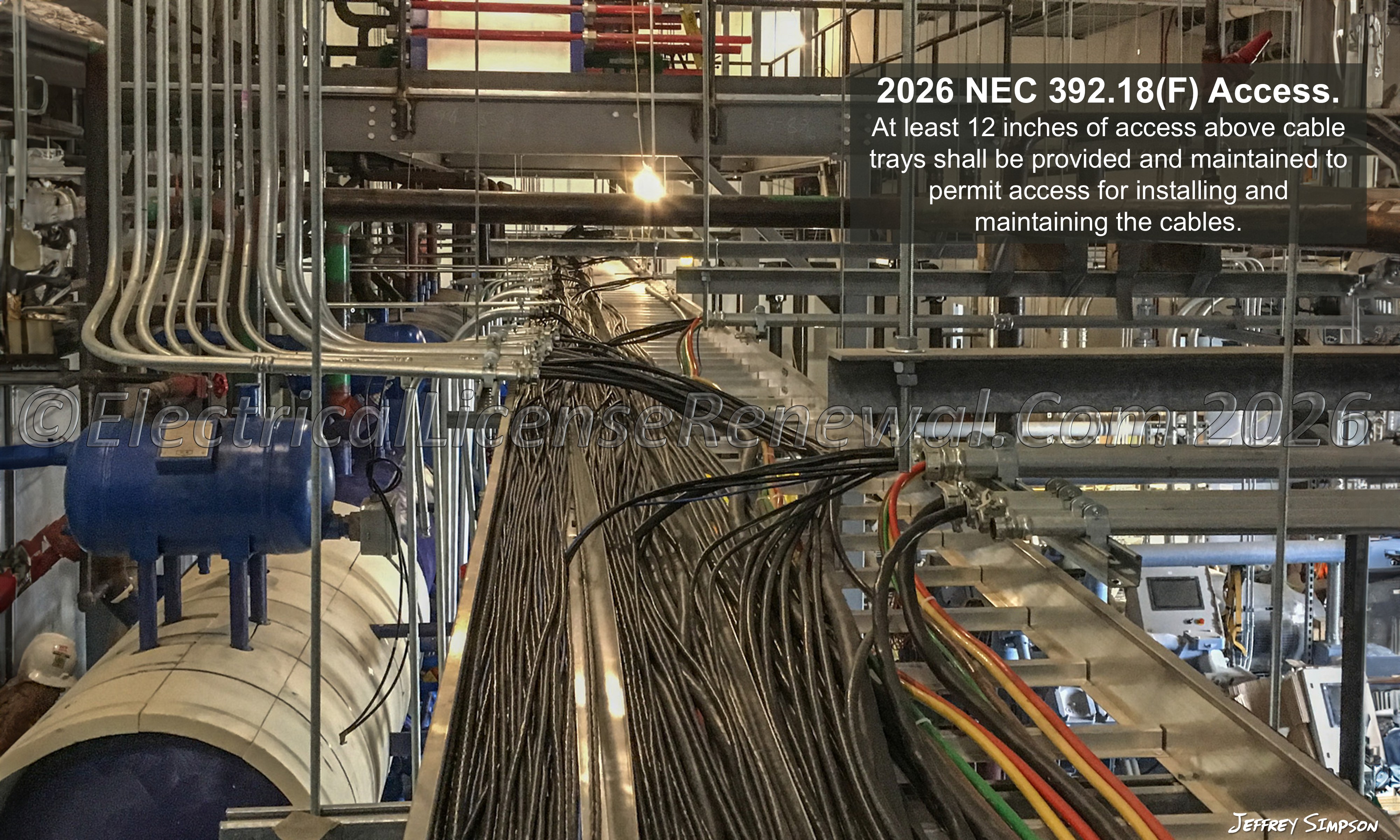 Code Change Summary: Revised code language in Section 392.18(F) now specifies a minimum of 12 inches of space above cable trays to ensure access for installation and maintenance.