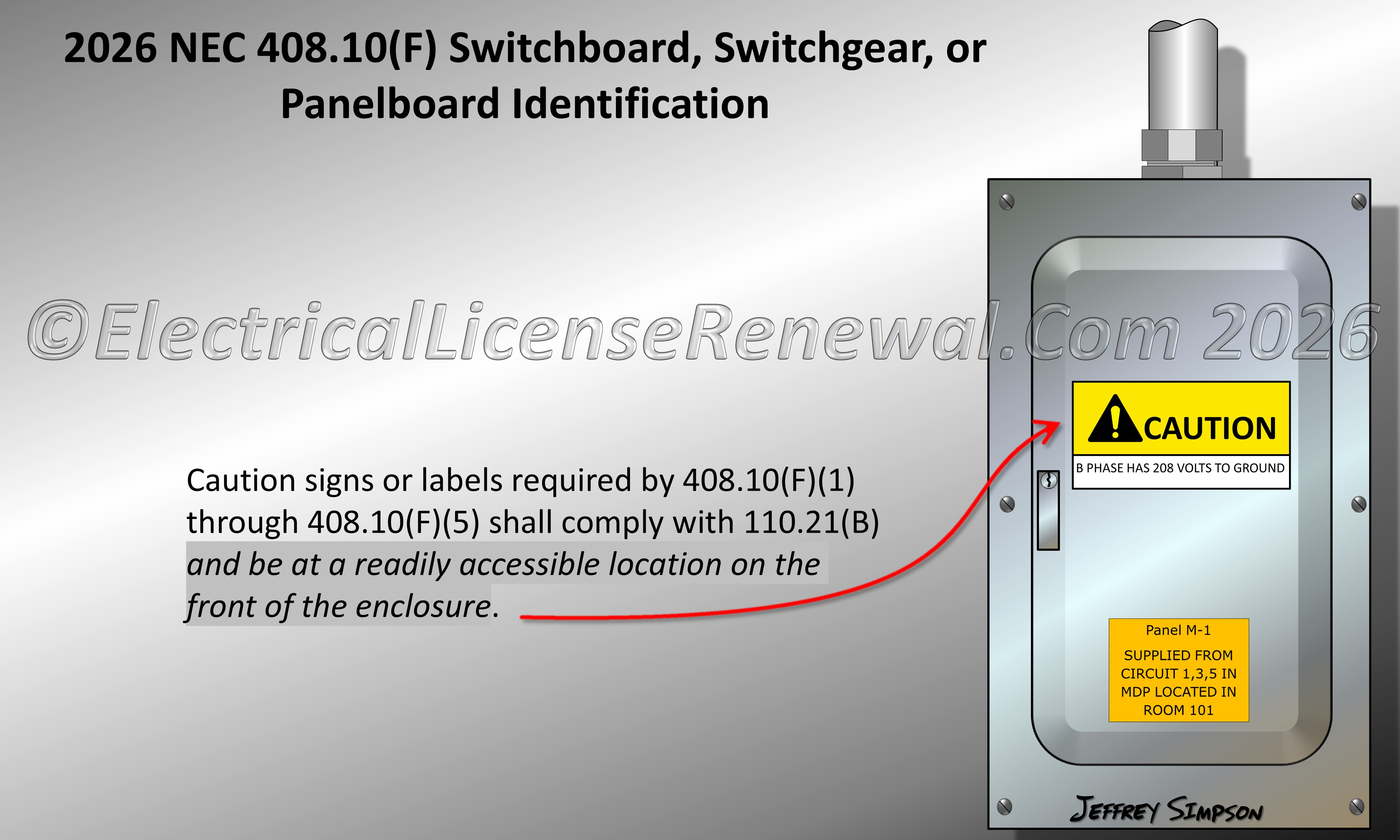 SME commentary: In the 2026 NEC®, previous Section 408.3(F) was renumbered as 408.10(F) and revised to improve clarity on the placement of field-applied hazard markings for switchboards, switchgear, and panelboards. The updated rule now requires any caution signs or labels specified in 408.10(F)(1) through (5) to comply with 110.21(B) and be at a readily accessible location on the front of the enclosure. This change strengthens visibility and accessibility requirements so that critical hazard warnings can be easily seen without the need to remove equipment covers or open doors.