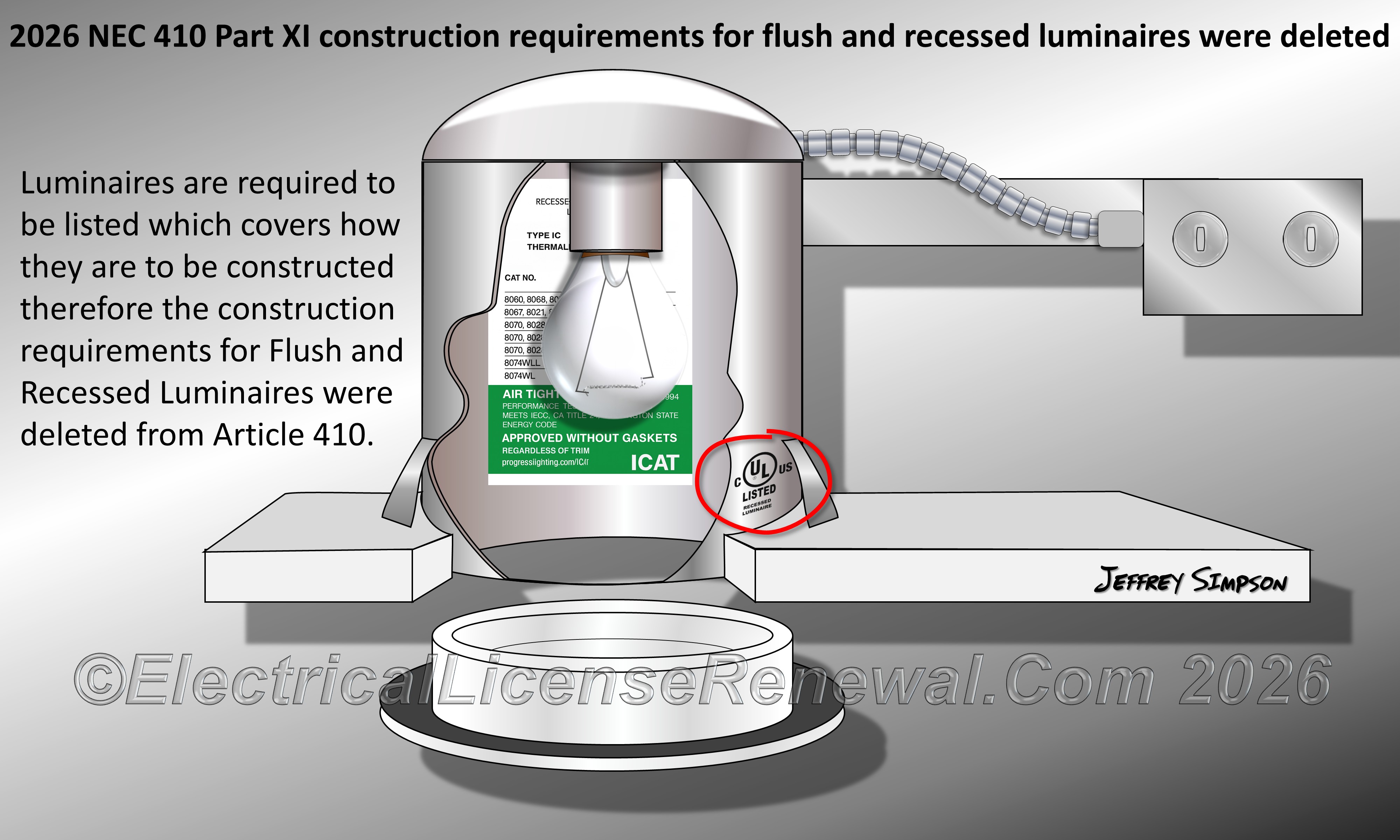 SME commentary: In the 2026 NEC®, previous Part XI of Article 410 titled Construction of Flush and Recessed Luminaires was deleted in its entirety. The deleted text had historically contained prescriptive construction details for luminaires such as temperature limitations, lamp wattage marking, solder restrictions, and lampholder material requirements. These provisions originated in much earlier editions of the Code, long before the widespread adoption of product safety standards and third-party certification programs. Their deletion reflects the NEC’s evolution toward performance-based requirements that rely on independent product listing standards rather than construction mandates written directly into the Code.