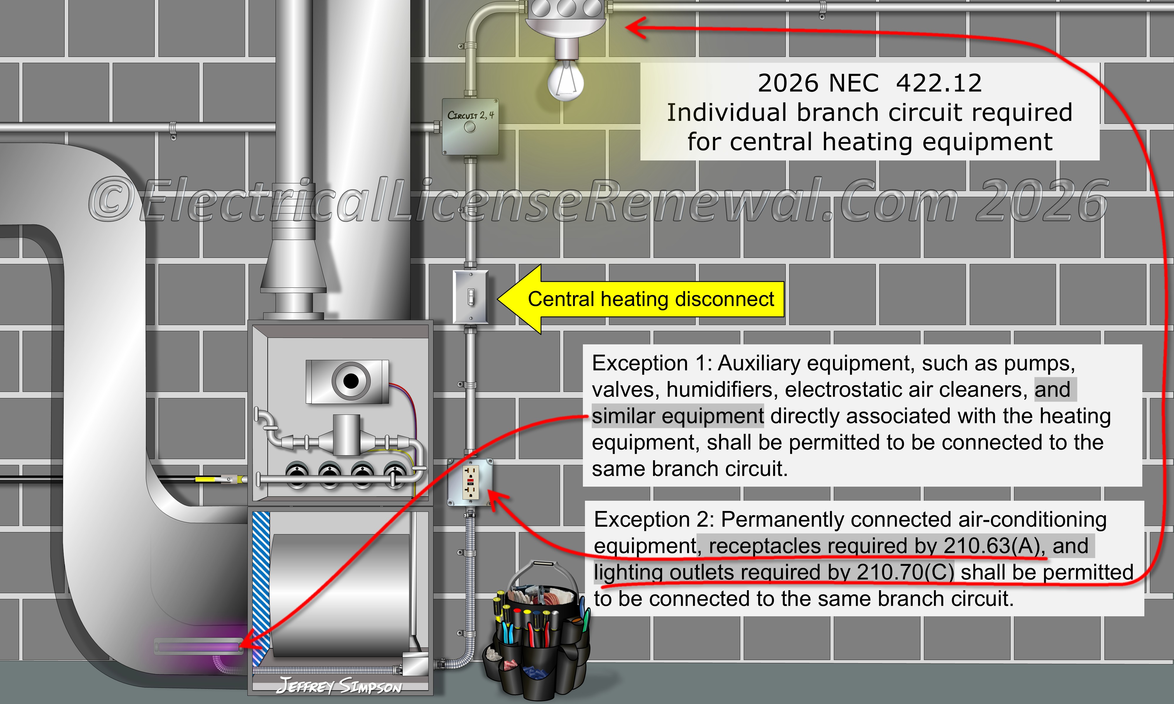 422.12 Central Heating Equipment. Central heating equipment other than fixed electric space-heating equipment shall be supplied by an individual branch circuit.