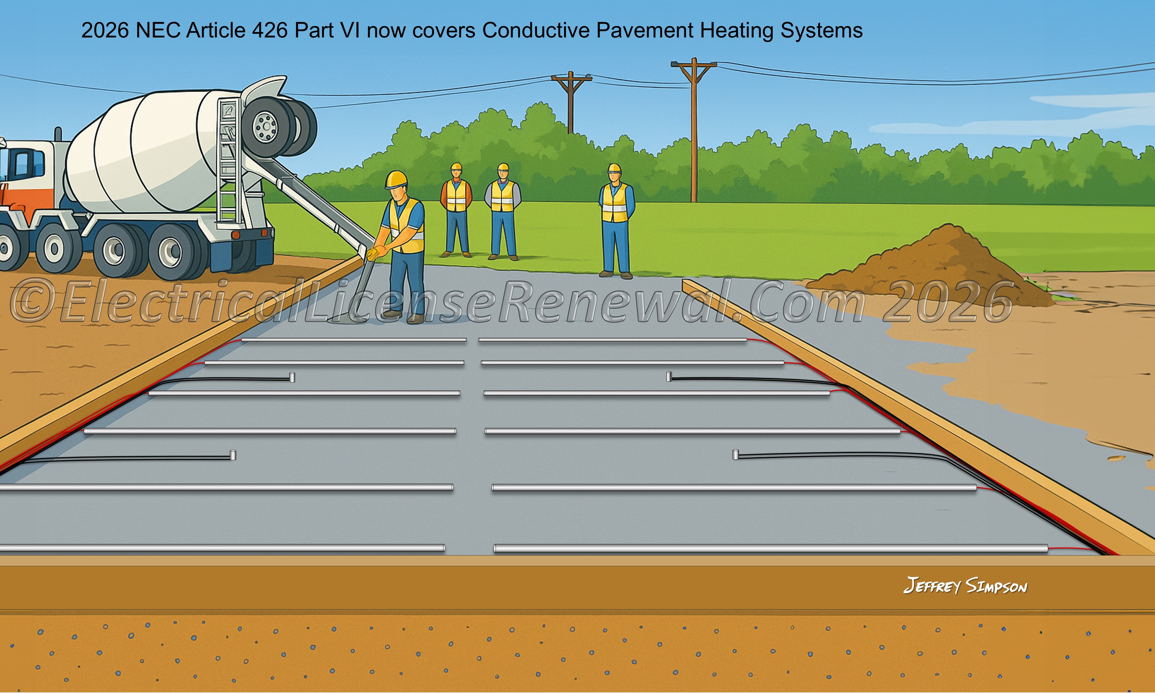 SME commentary: The 2026 NEC® relocates the control and protection requirements of Article 426 to new Part VII to accommodate a new Part VI addressing conductive pavement heating systems. These installations generate heat by passing current through the pavement between embedded heating electrodes that enable snow and ice melting without traditional resistance cables. The pavement mixture itself includes additives, such as carbon fiber, to enhance and increase the pavement conductivity. This new section provides much needed direction for a technology emerging from research at Iowa State University Department of Civil, Construction and Environmental Engineering with several pilot installations.