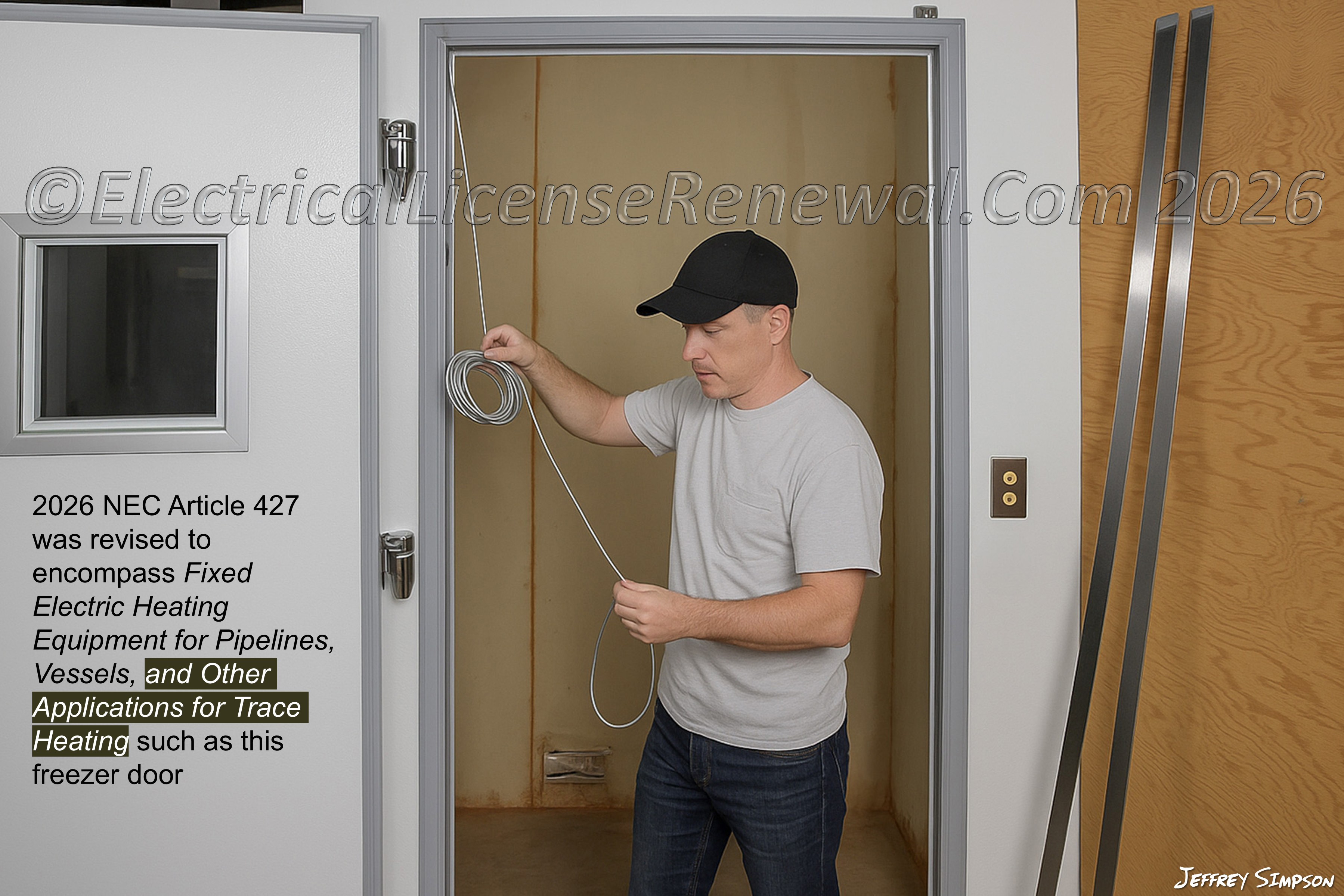 SME commentary: In the 2026 NEC®, the title and scope of Article 427 were revised to encompass fixed electric heating equipment for pipelines, vessels, and other applications for trace heating. This change clarifies that the article applies not only to pipeline and vessel heat tracing but also to other fixed heating installations that use similar technology and materials. These systems include those designed to prevent freezing on commercial and industrial freezer doors, condensate drain lines, and other specialized equipment.