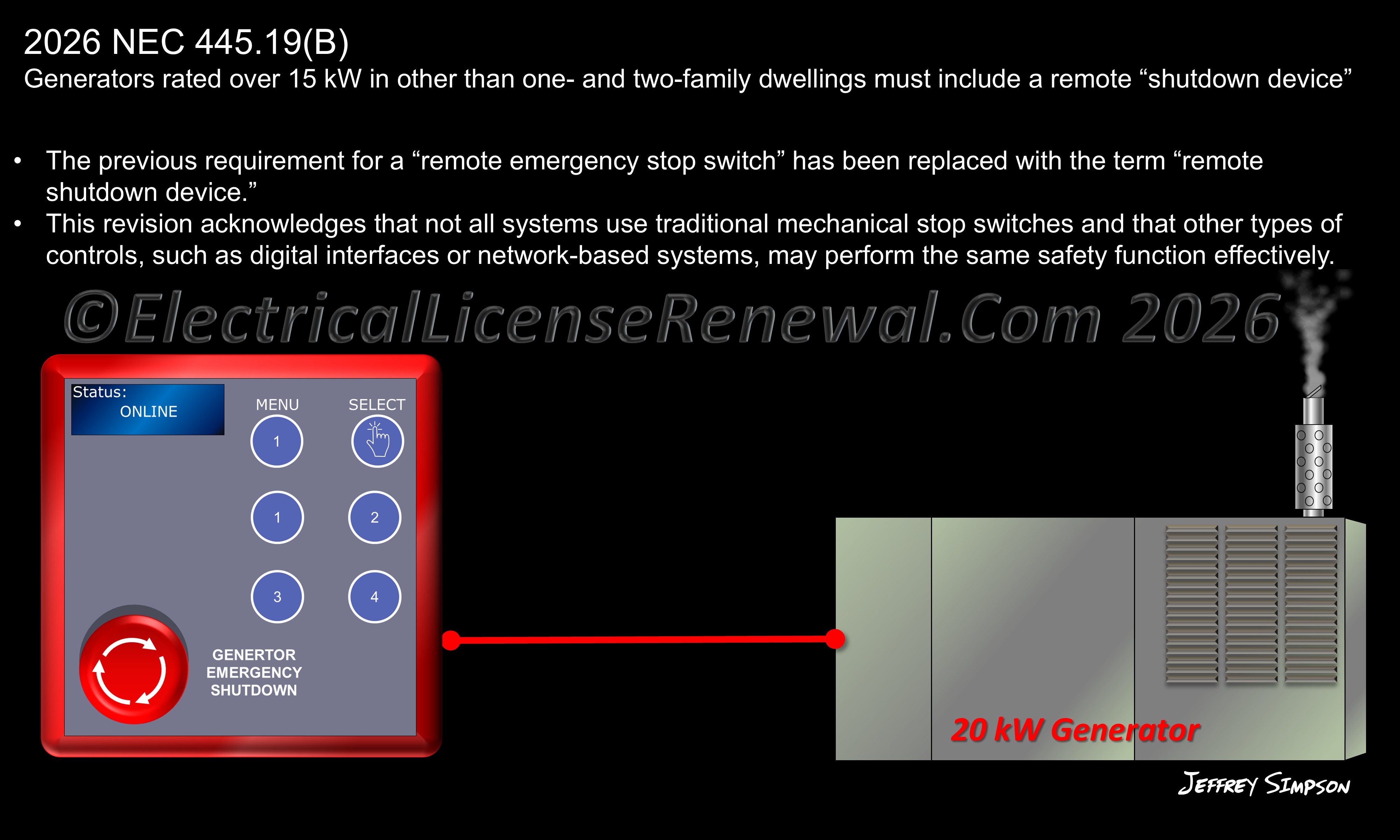 SME commentary: In the 2026 NEC®, Section 445.19(B) has been restructured to improve usability and broaden the types of acceptable technology for generator shutdown. The previous requirement for a “remote emergency stop switch” has been replaced with the term “remote shutdown device.” This revision acknowledges that not all systems use traditional mechanical stop switches and that other types of controls, such as digital interfaces or network-based systems, may perform the same safety function effectively. The revised section also adopts a clearer list format to outline the installation and marking criteria for these devices.