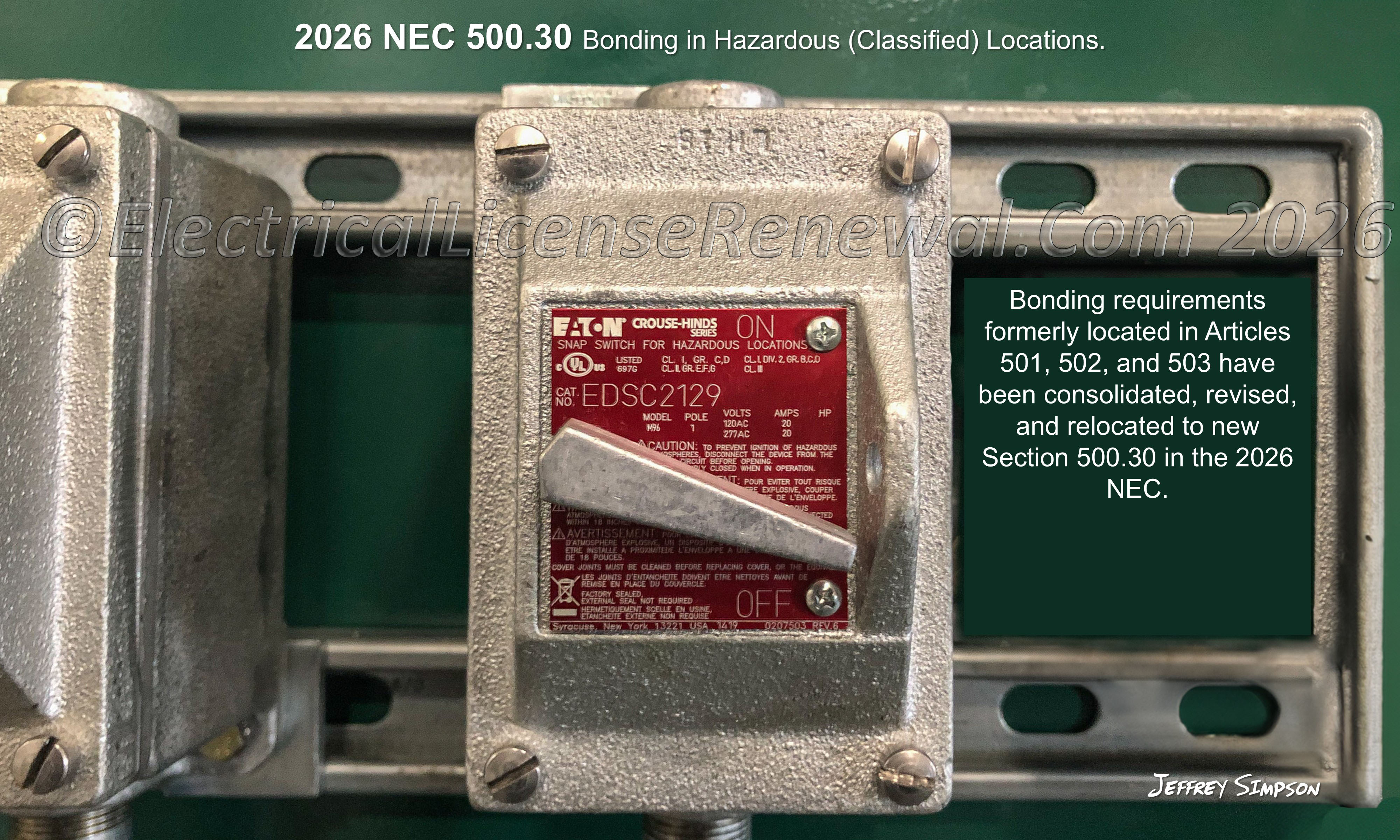 SME commentary: In the 2026 NEC®, the bonding provisions that appeared separately in Sections 501.30, 502.30, and 503.30 were removed and consolidated into new Section 500.30, Bonding in Hazardous (Classified) Locations. The change was introduced to eliminate repetitive language, improve usability, and ensure uniform application of bonding requirements across all hazardous location classes and divisions.