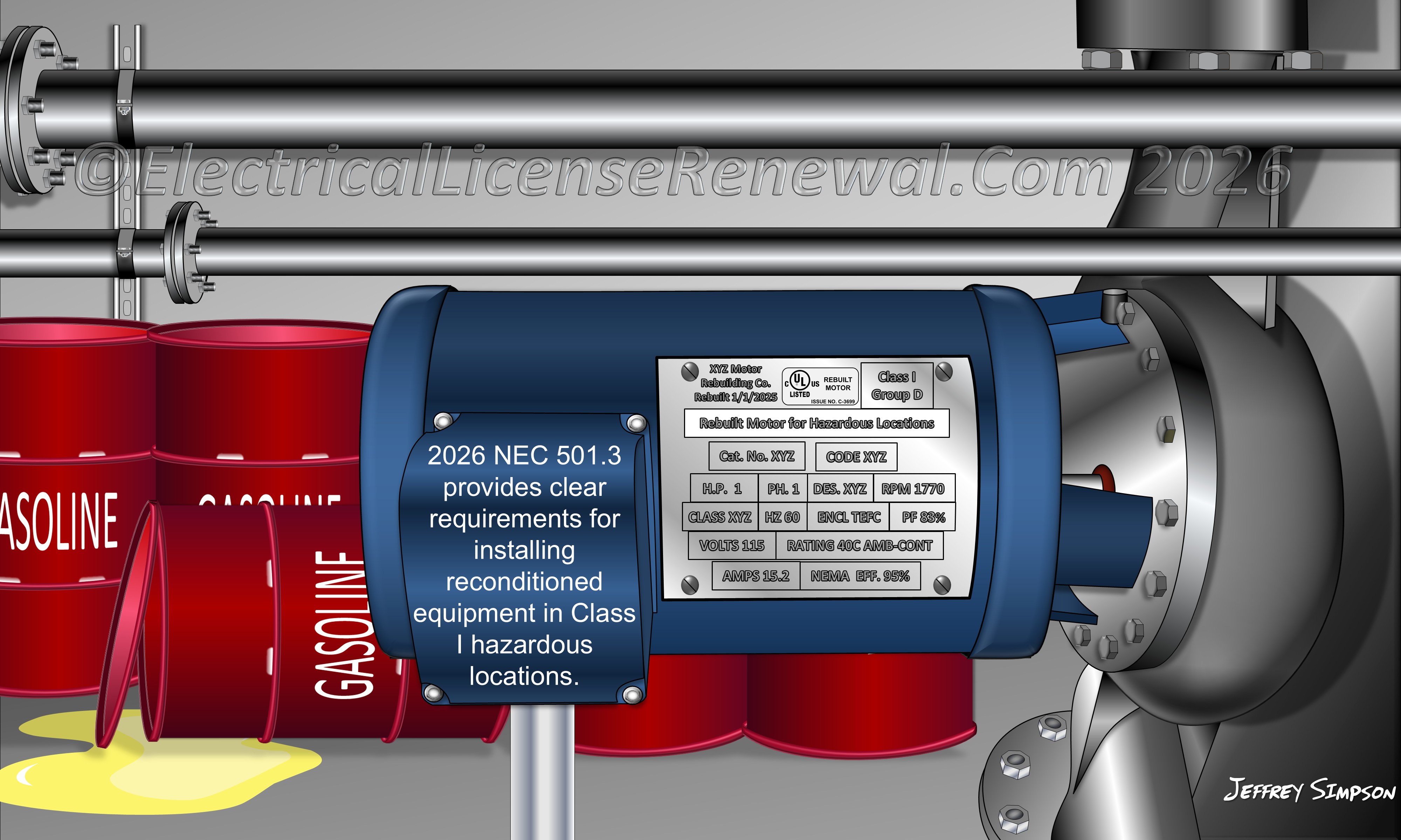 SME commentary: In the 2026 NEC®, new Section 501.3 provides clear requirements for installing reconditioned equipment in Class I hazardous locations. This new section represents the outcome of a multi-cycle effort to properly locate and formalize reconditioning rules that had previously appeared in other parts of the Code, including Article 430. The addition aligns hazardous (classified) location requirements with existing NEC® provisions addressing how equipment is treated when reconditioned.