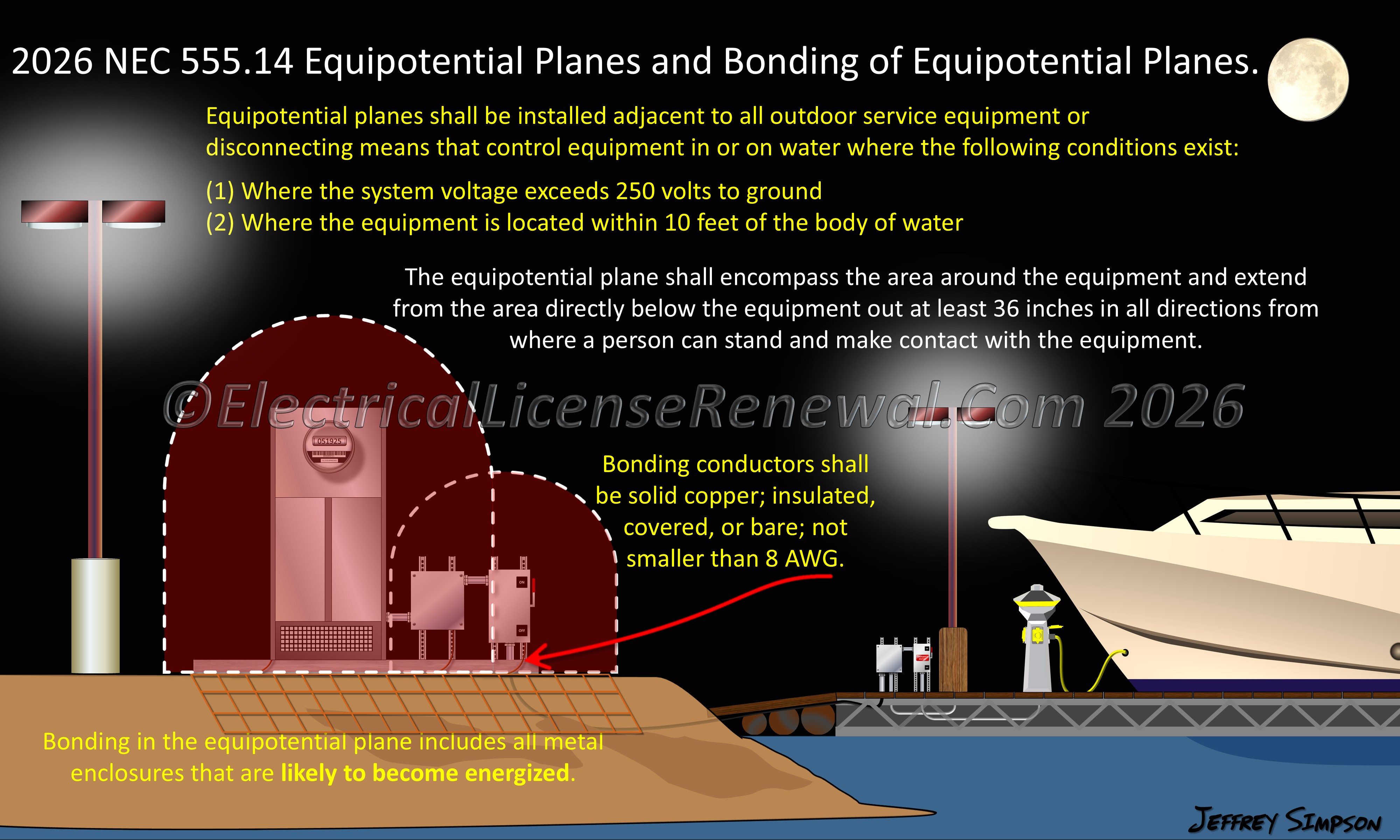 SME commentary: In the 2026 NEC®, Section 555.14(A) was expanded to provide specific construction requirements for equipotential planes used in marinas, boatyards, floating buildings, and docking facilities. Equipotential planes are defined in Article 100 as “conductive elements that are connected together to minimize voltage differences.” In these waterfront environments, equipotential planes are essential for reducing the risk of electrical shock to personnel who may simultaneously contact conductive surfaces and earth, particularly in wet or submerged areas.