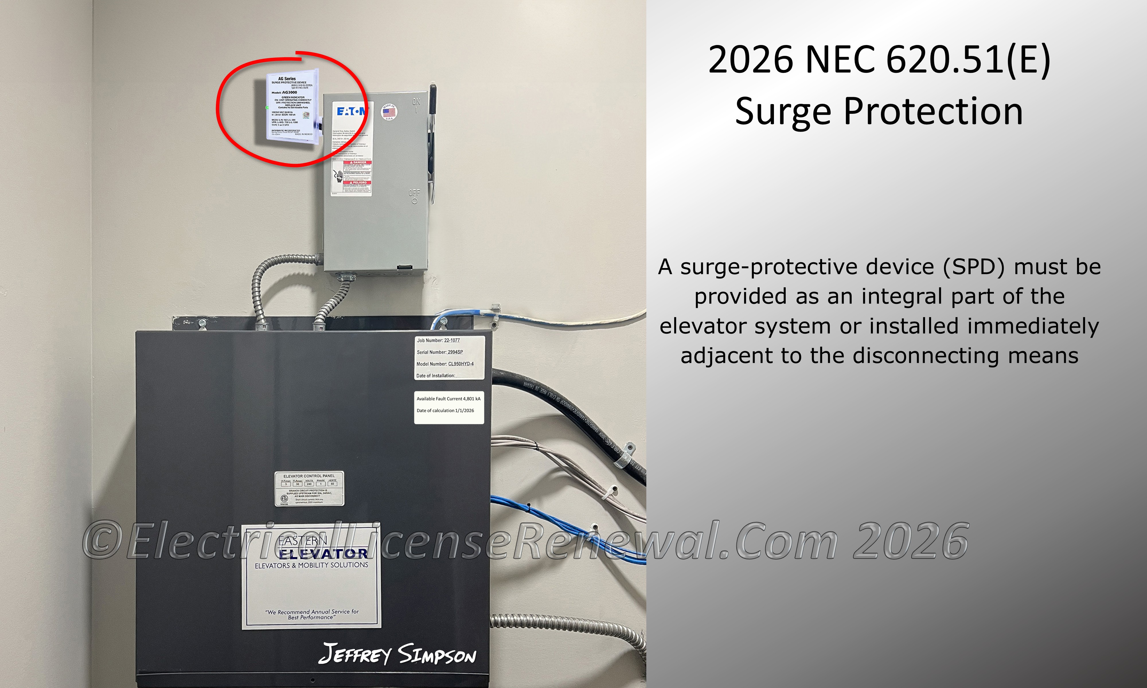 620.51(E) Surge Protection. A surge-protective device (SPD) shall be provided as an integral part of the elevator system or installed immediately adjacent to the disconnecting means.