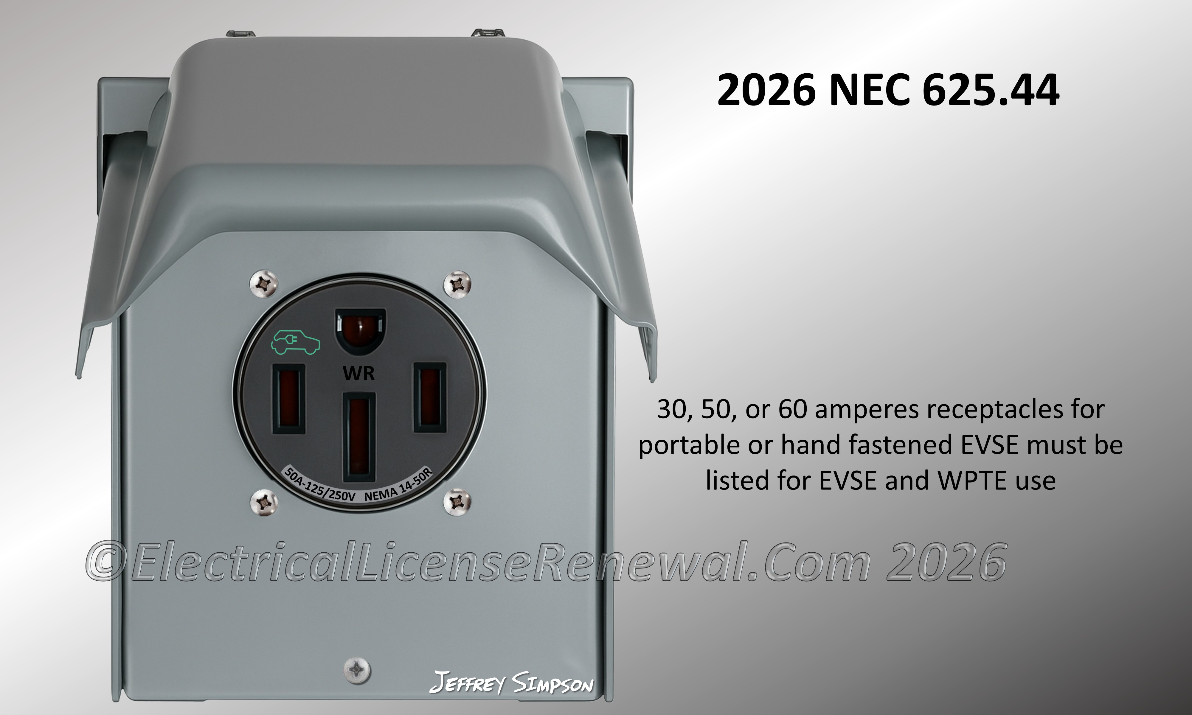 SME commentary: SME commentary: In the 2026 NEC®, Section 625.44 was revised to address several concerns related to the connection of electric vehicle supply equipment (EVSE) and wireless power transfer equipment (WPTE). The updated section expands the receptacle types and ratings permitted for EVSE and WPTE, incorporates new voltage classes, and adds safeguards to prevent mismatched branch-circuit and receptacle ratings. These revisions reflect the increasing diversity of EV charging products and the need for receptacles that can operate safely under continuous charging loads.