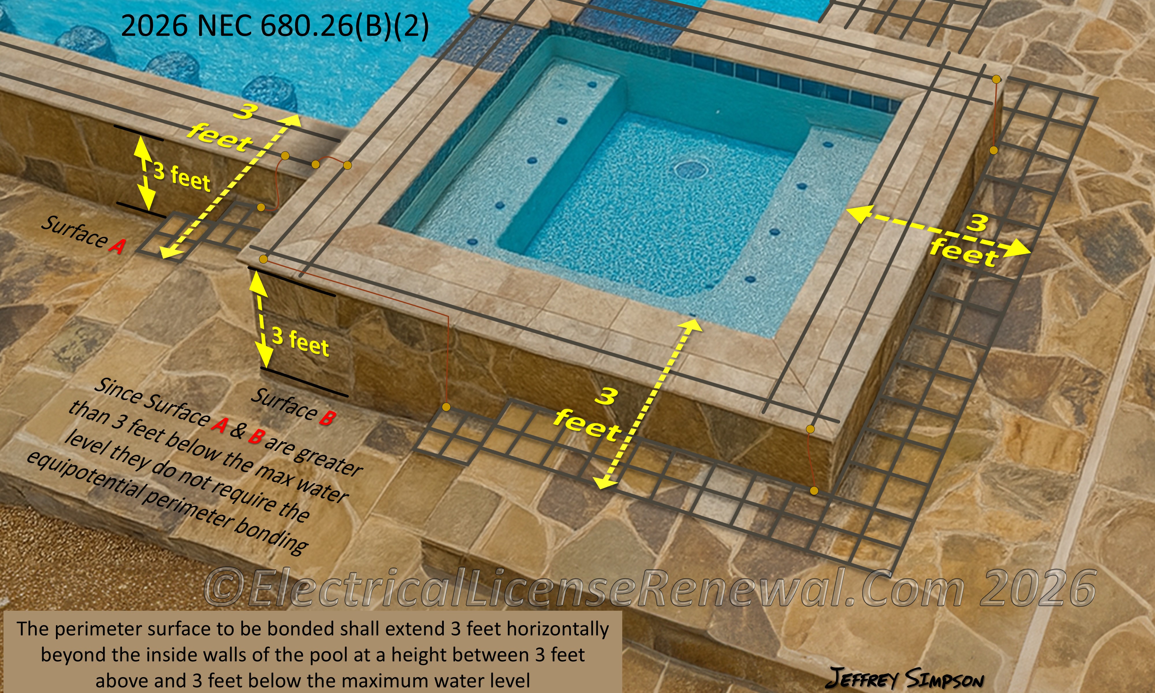 To address this, the 2026 NEC® revises the vertical measurement used to define the bonding zone. Section 680.26(B)(2) now states that the perimeter surface to be bonded shall extend 3 feet horizontally beyond the inside walls of the pool at a height between 3 feet above and 3 feet below the maximum water level. This change replaces the previous 2-foot below reference with a more realistic representation of human reach based on typical standing height relative to the deck and waterline.