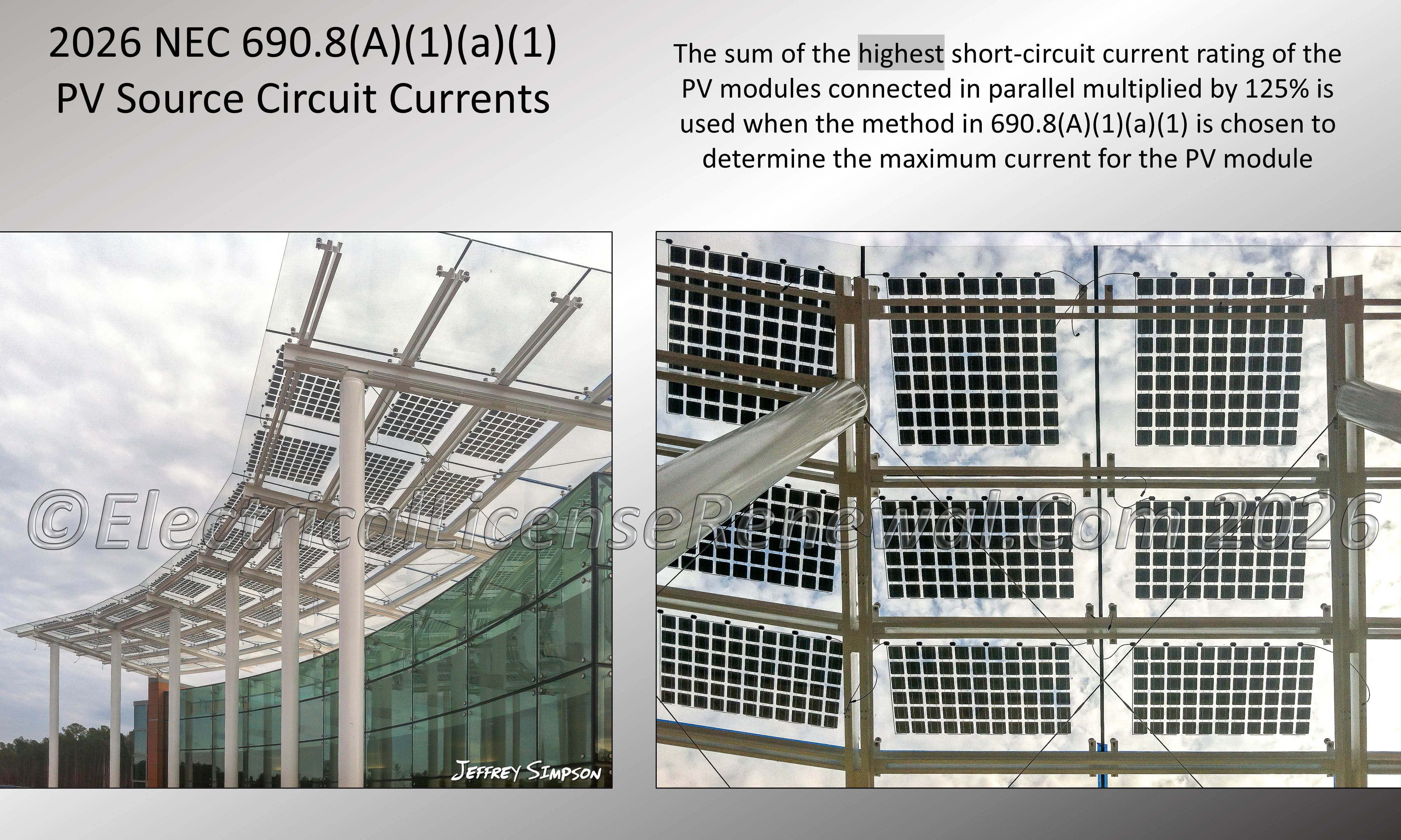 SME commentary: Section 690.8(A)(1) in the 2026 NEC® has been revised to address growing variability in PV module design, particularly bifacial modules (two-sided) which can produce power from both sides of the PV module. Traditional modules have an opaque backing sheet under the PV cells whereas bifacial modules can be frameless allowing exposure to the top and bottom of the PV module permitting significant gains in additional power produced by the module. This is beneficial for PV module installations where adjacent building surfaces are highly reflective (see image).