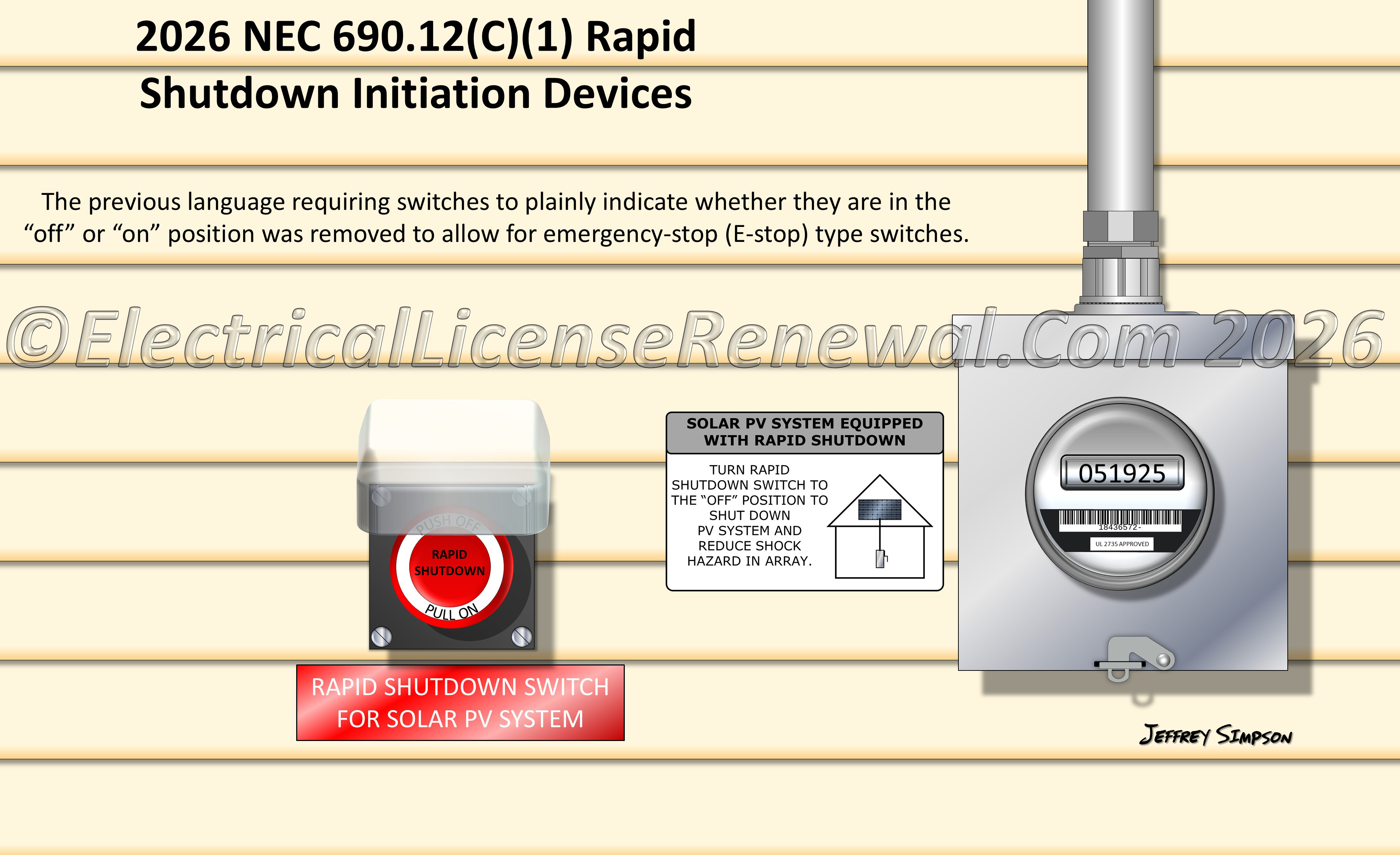 The list of permissible rapid shutdown initiation devices in 690.12(C)(1) was simplified to service disconnecting means, PV system disconnecting means, and listed switches. The previous language requiring switches to plainly indicate whether they are in the “off” or “on” position was removed to allow for emergency-stop (E-stop) type switches. E-stops have historically been used in the field, and since the basic function of these switch types is easily evident, the previous marking requirement for a plain indication of the switch positions was not needed.