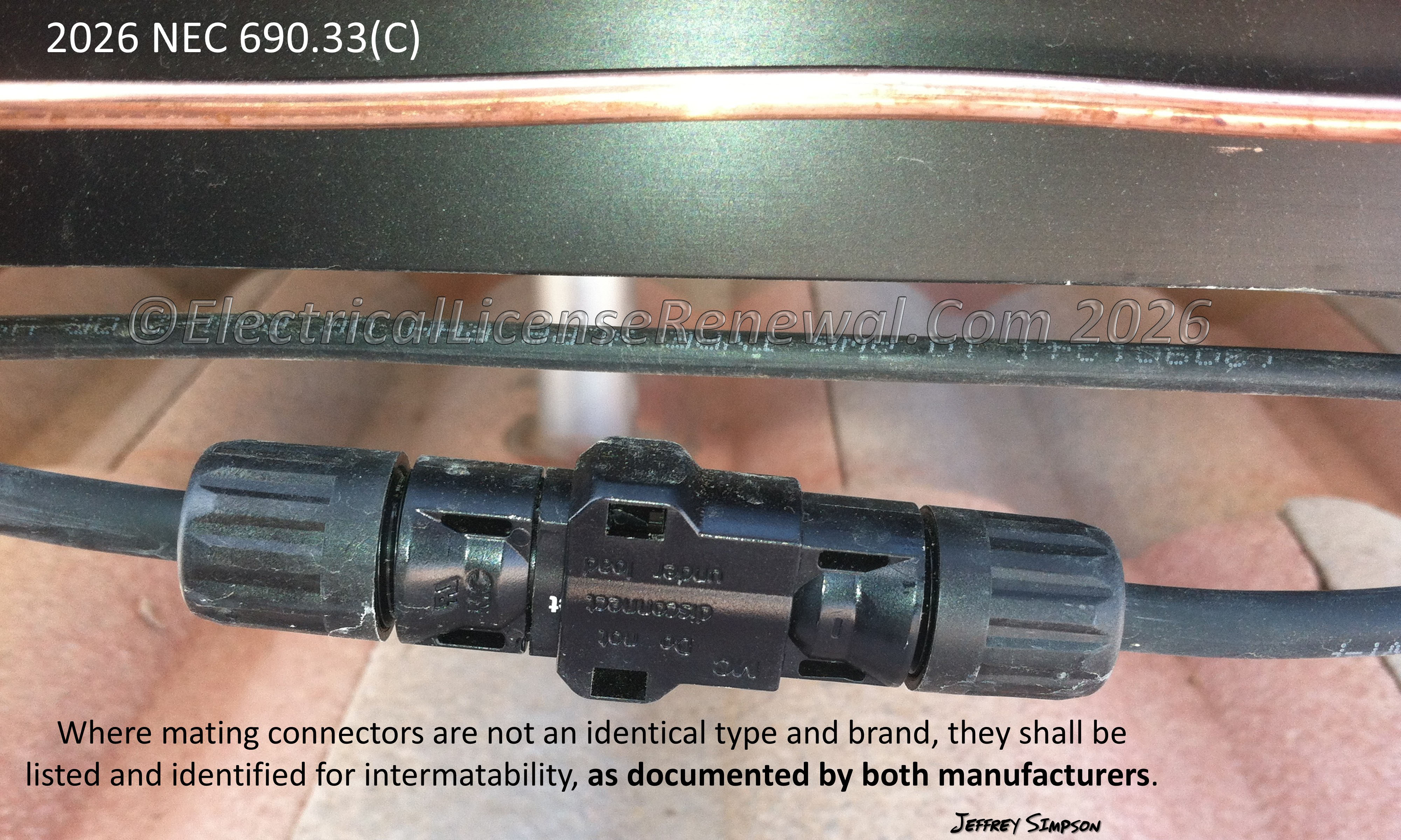 SME commentary: In the 2026 NEC®, Section 690.33(C) was revised to address compatibility concerns surrounding the mating connectors commonly used in PV dc circuits. These connectors are routinely installed in PV module strings that often involve locking connectors sourced from multiple manufacturers. For many years the NEC® relied on a simple requirement that nonidentical connectors be “listed and identified for intermatability” as described in the manufacturer’s instructions. That approach assumed that a single manufacturer’s documentation was sufficient to confirm proper mating with the other connector from a different manufacturer, but field experience has shown that the instructions for some products do not provide the level of detail needed to ensure sufficient compatibility.