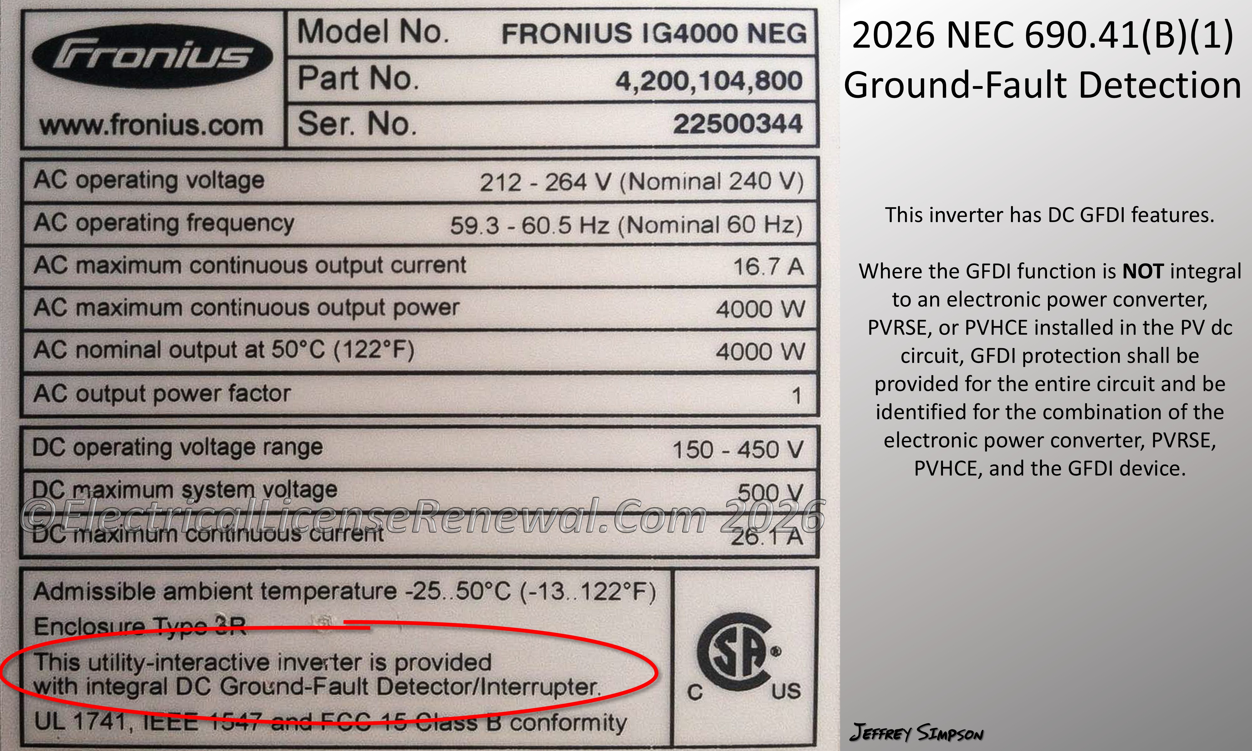 This inverter has DC GFDI features. Where the GFDI function is NOT integral to an electronic power converter, PVRSE, or PVHCE installed in the PV dc circuit, GFDI protection shall be provided for the entire circuit and be identified for the combination of the electronic power converter, PVRSE, PVHCE, and the GFDI device.