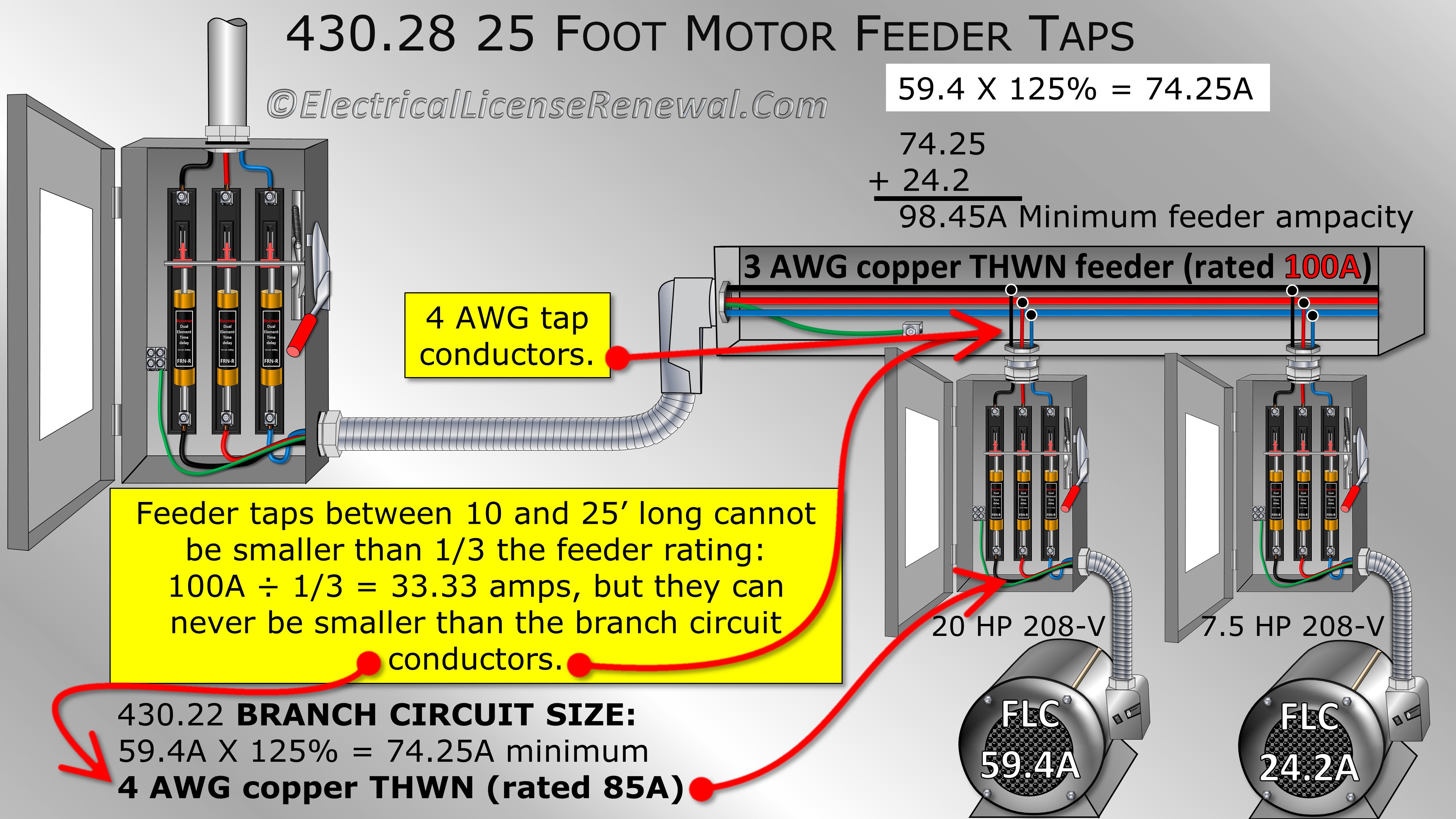 Without using the exceptions, the most common motor feeder taps will be the 10 foot and 25 foot tap rules. The 10 foot tap rule applies when there is no more than 10 foot of tap conductor stealing power from the feeder serving the group of motors. Likewise, the 25 foot tap rule applies when there is more than 10 foot but not more than 25 foot of tap conductor between terminals.